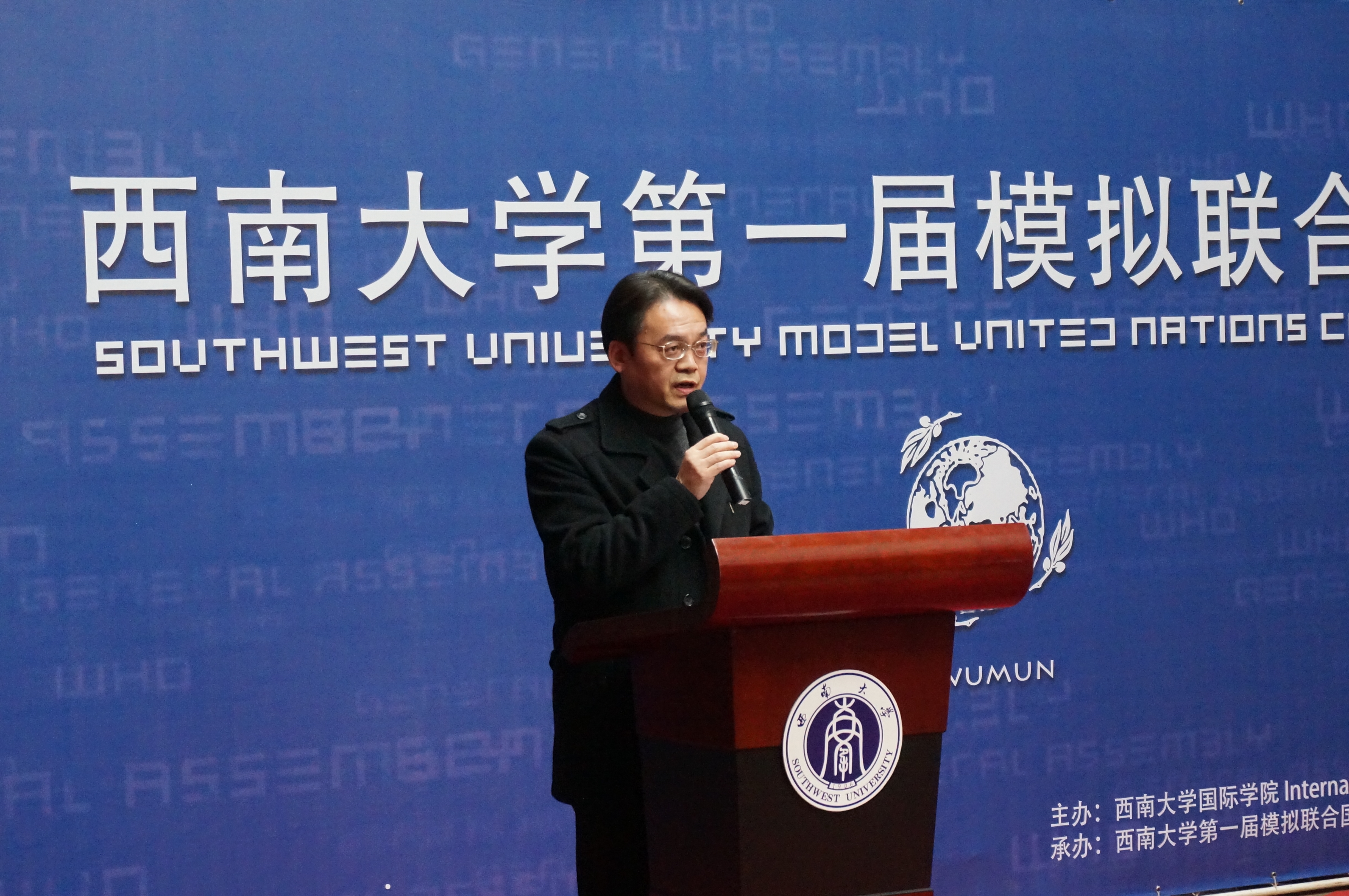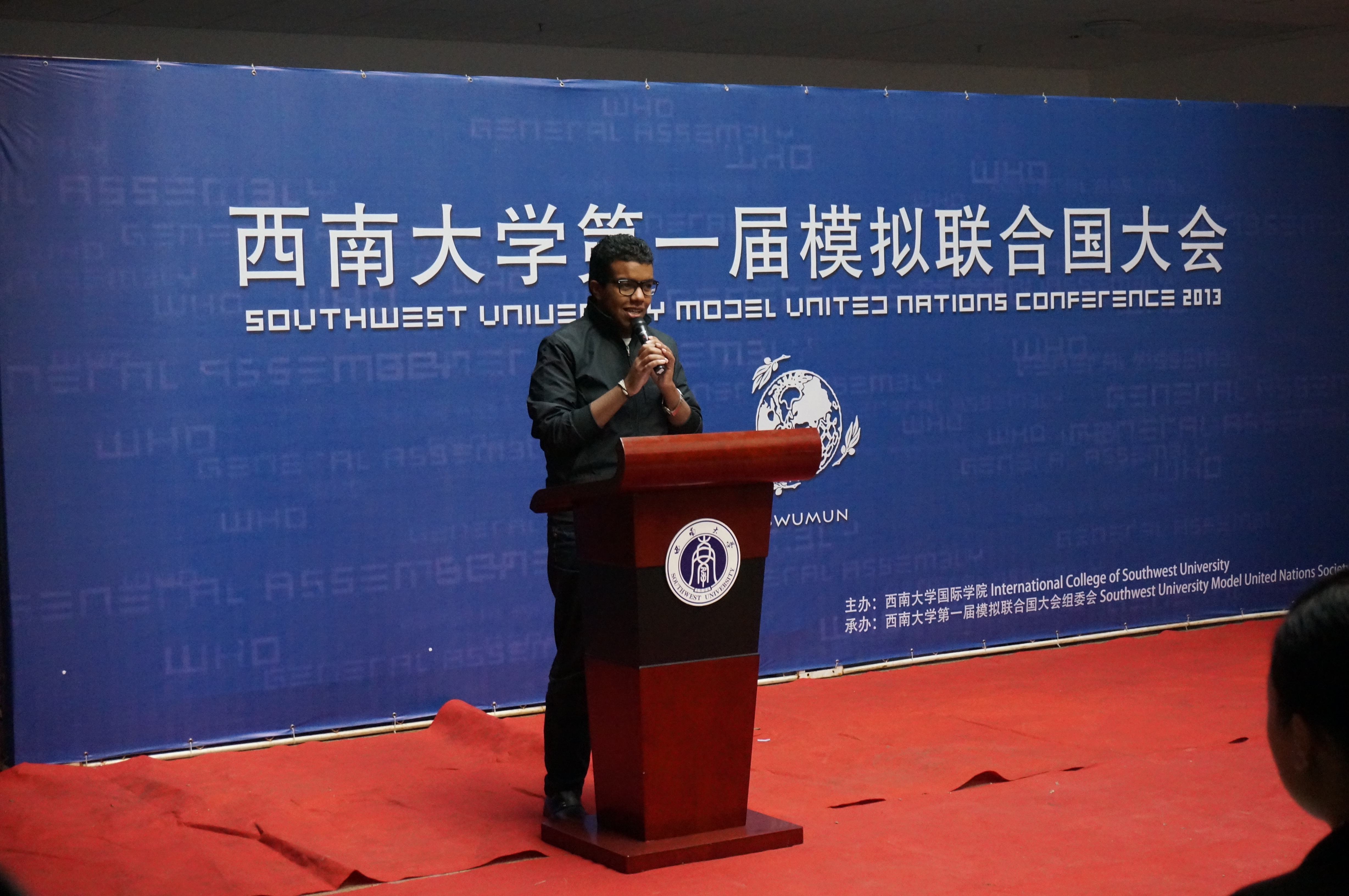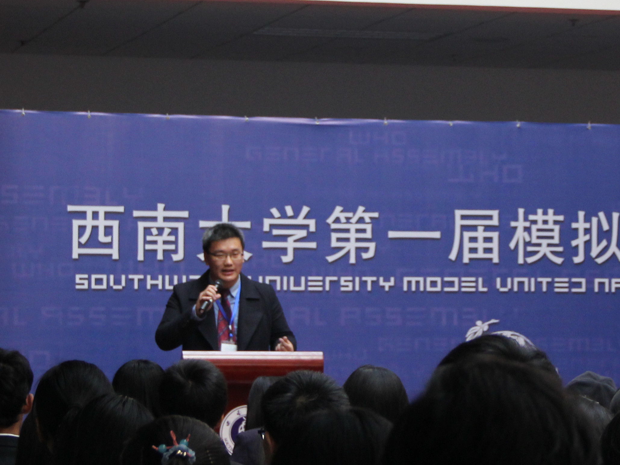 刘经理的讲话从模联对老员工的益处入手,就知识的增加和能力的提高进行了阐述,并介绍了本次大会的议题,他还对参会同学提出了殷切的希望。希望他们在两天的会议中“积极思考,畅所欲言,沟通合作,激扬风采,为世界的和平与发展贡献一份心力。用模拟的会议谱写真实蓝图。”紧接着,122cc太阳成集团官网第一届模拟联合国大会秘书长袁晔发表了讲话,他以全英文的形式向大家介绍了本次模拟联合国大会的主要内容,回忆了自己和模联的故事,讲述了西大模联发展的心路历程和大会筹备过程中的切身感受。最后,他对众多付出辛勤与汗水的幕后工作人员表示了衷心的感谢。