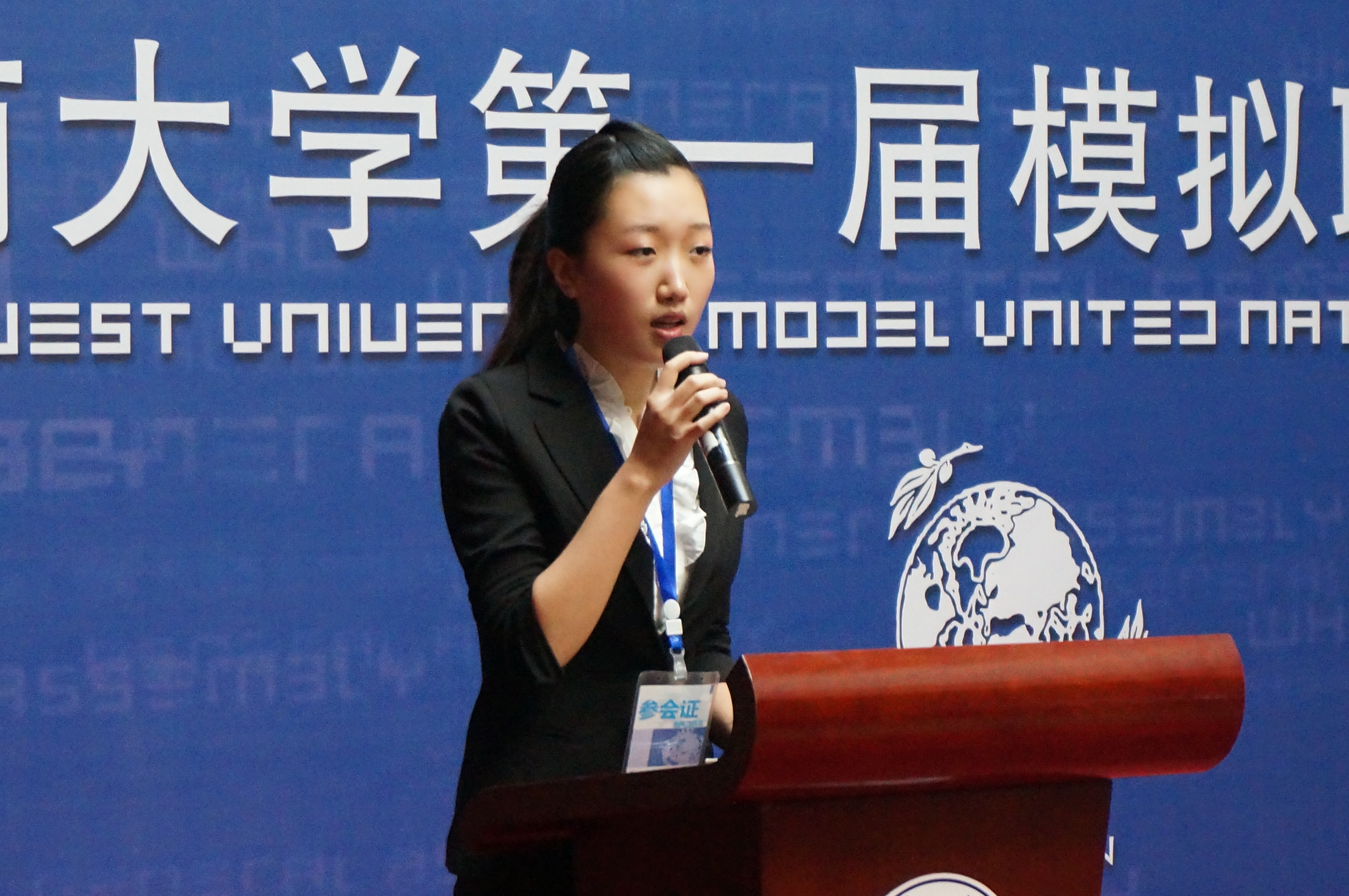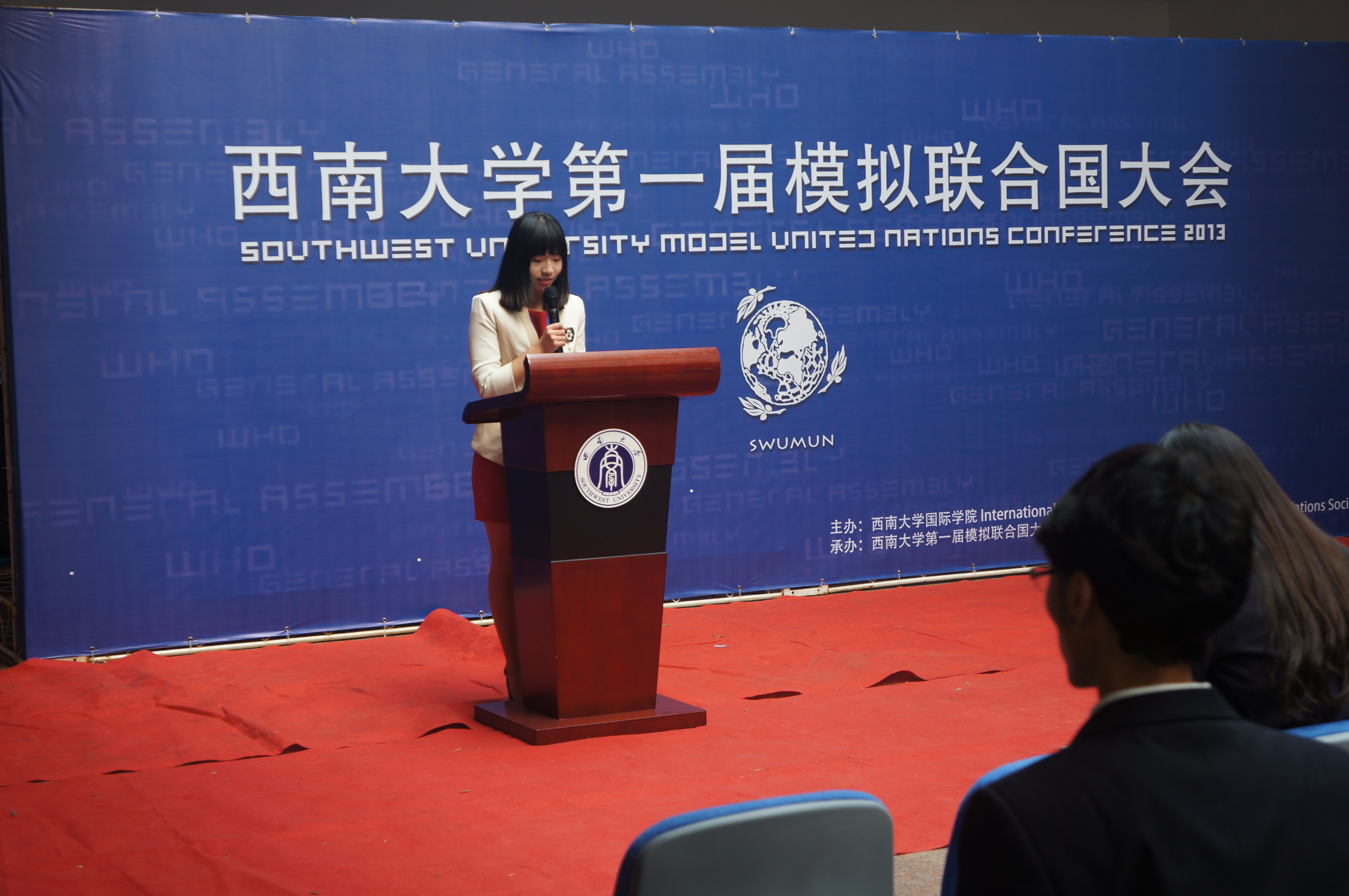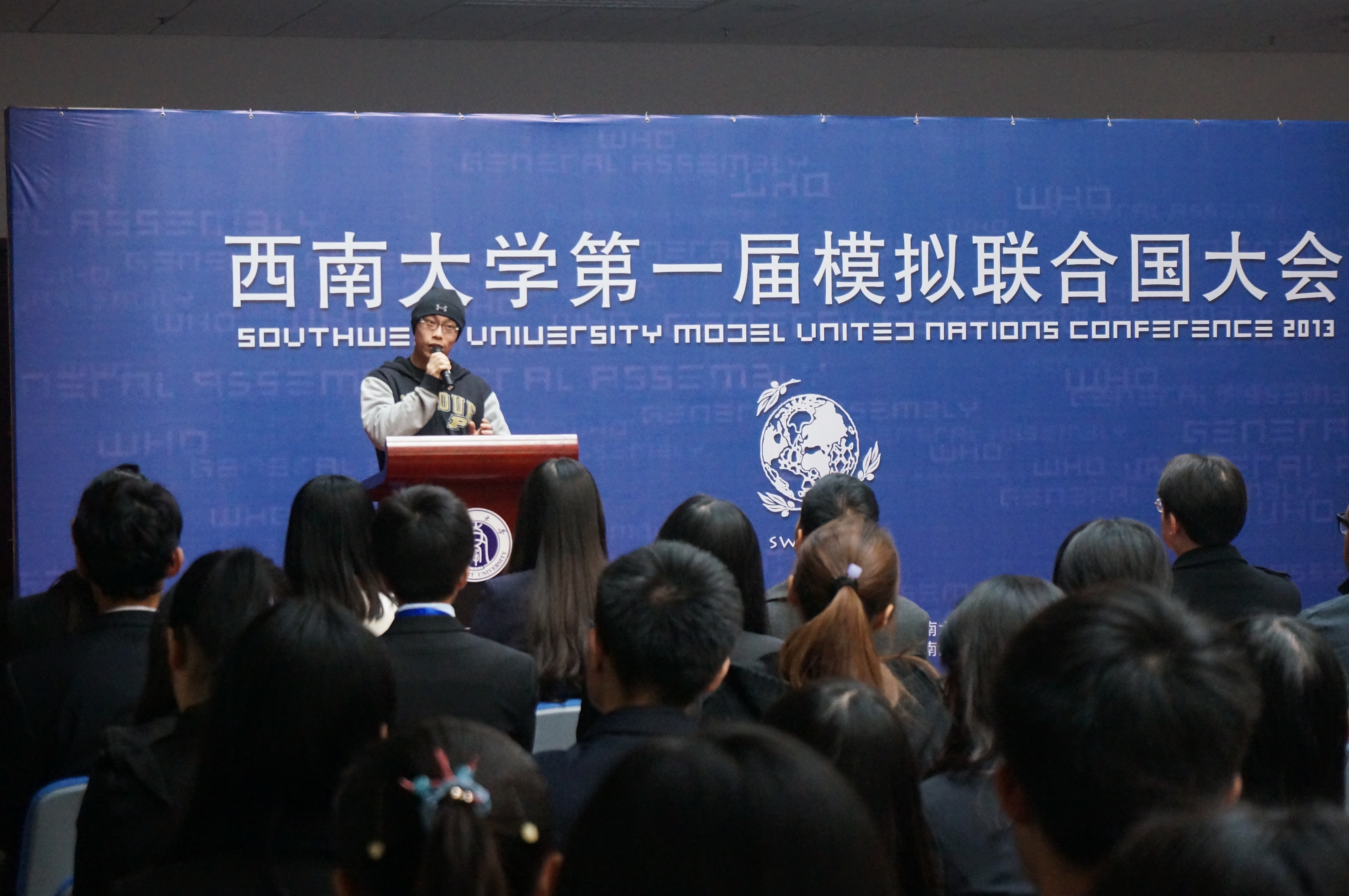 刘经理的讲话从模联对老员工的益处入手,就知识的增加和能力的提高进行了阐述,并介绍了本次大会的议题,他还对参会同学提出了殷切的希望。希望他们在两天的会议中“积极思考,畅所欲言,沟通合作,激扬风采,为世界的和平与发展贡献一份心力。用模拟的会议谱写真实蓝图。”紧接着,122cc太阳成集团官网第一届模拟联合国大会秘书长袁晔发表了讲话,他以全英文的形式向大家介绍了本次模拟联合国大会的主要内容,回忆了自己和模联的故事,讲述了西大模联发展的心路历程和大会筹备过程中的切身感受。最后,他对众多付出辛勤与汗水的幕后工作人员表示了衷心的感谢。