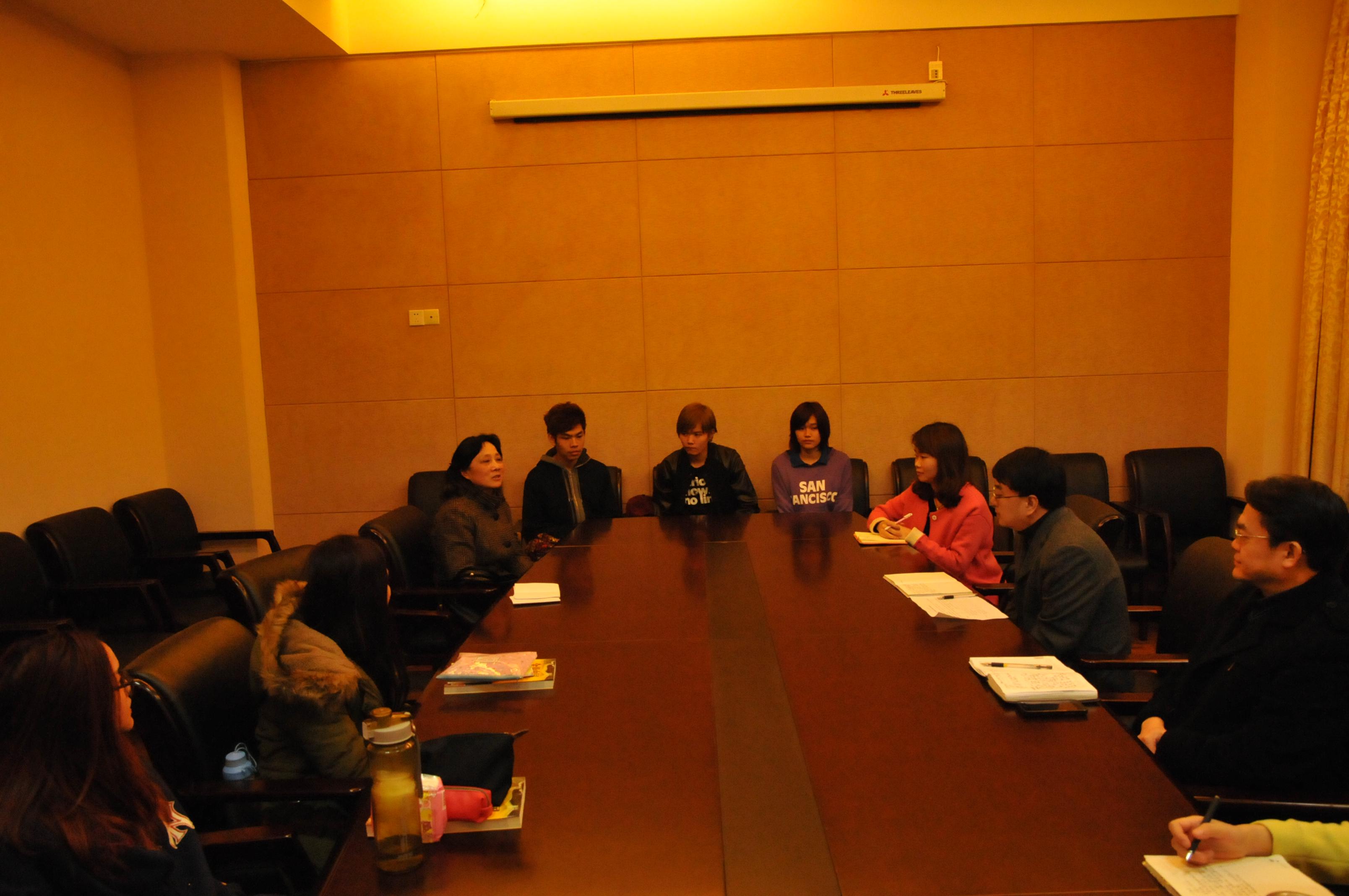 2013年12月3日下午5点,泰国正大管理公司"1+1+2"商务汉语本科项目班师生座谈会在太阳成集团tyc122cc310会议室举行。太阳成集团tyc122cc总支书记兼副经理刘猛、副经理张家政、系主任耿军、学工办主任陈雨曦以及教师代表任崇芬、黎力、班主任李丹和部分员工代表参加座谈。