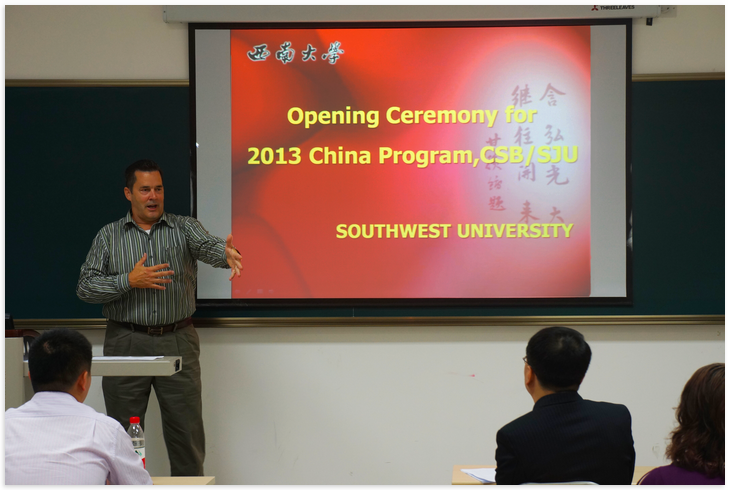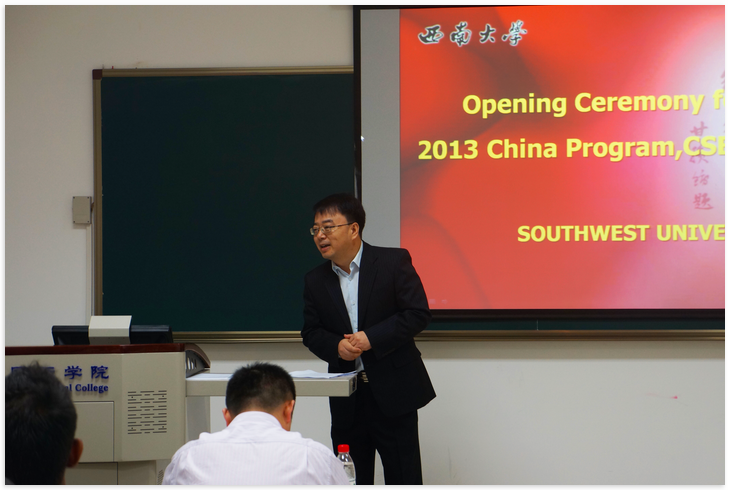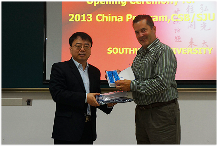 张经理对来自美国的师生表示了热烈的欢迎。他热情地介绍了重庆以及122cc太阳成集团官网,并对大家在122cc太阳成集团官网的学习和生活提出了亲切的希望,祝愿大家在122cc太阳成集团官网学习顺利、生活愉快。随即,领队教师Marsnik教授、教师代表王勇老师、员工代表也相继发言。最后,张经理代表太阳成集团tyc122cc向领队教师赠送了礼物,大家合影留念,开学典礼顺利结束。