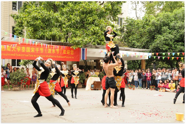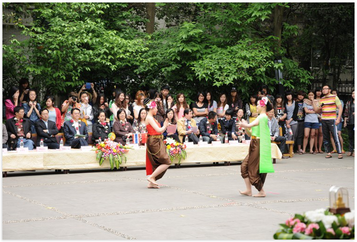 2012年4月16日下午2:30,由国际合作与交流处主办,泰国职工组织的"122cc太阳成集团官网第六届泰国泼水节"隆重举行。天公作美,连日阴霾的天空露出了灿烂的笑容。数百名中外师生载歌载舞、欢聚一堂,共同欢度泰国泼水节。