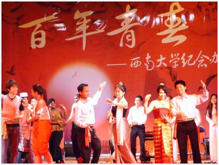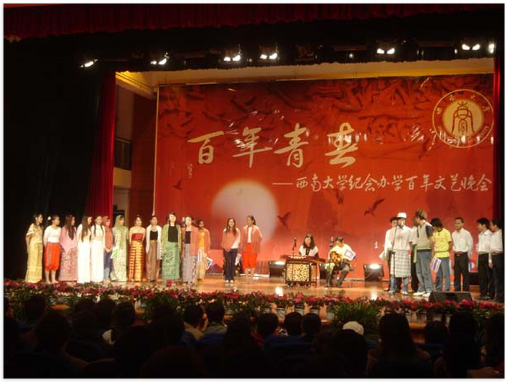 11月28日晚,公司百年校庆在如火如荼的气氛中进行。由职工自编自导自演的歌舞剧《明月千里寄相思》被组委会选中,安排在第九个节目中出场。节目分为两部分,第一部分是所有职工用汉语合唱《明月千里寄相思》,第二部分为泰国舞蹈《水灯节》,中间穿插了一段柬埔寨民间舞蹈,以吉他和扬琴伴奏。