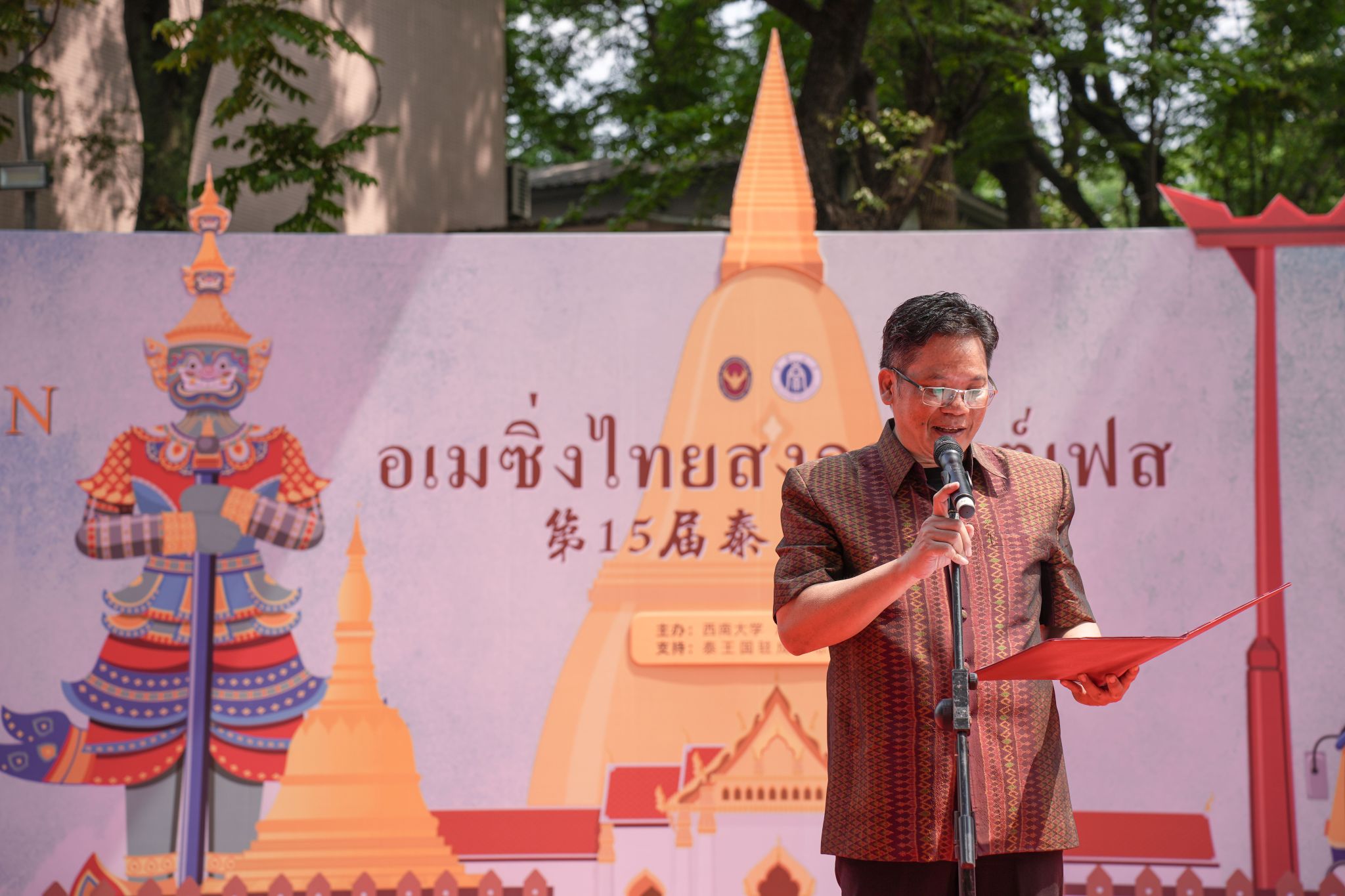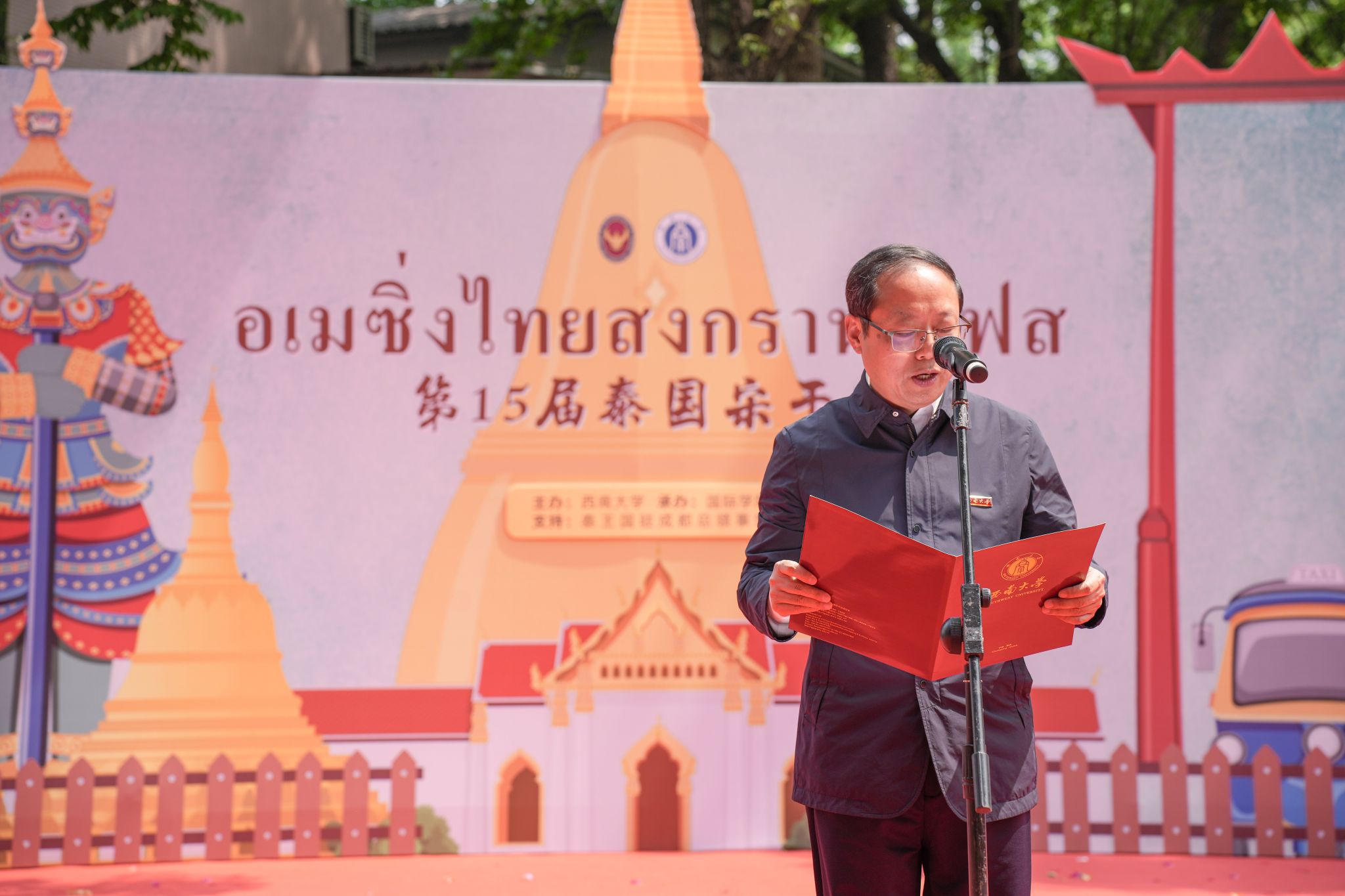 泰国驻成都总领事萨克·诺泰松先生致开幕辞,他表示在122cc太阳成集团官网举办宋干节活动不仅是泰国传统的延续,也是一种对泰国传统文化的创造性保护和创新性表达,还是泰国职工展现热爱传统、传承文化的责任感的良机,衷心感谢122cc太阳成集团官网提供这一中泰文化交流的宝贵平台。