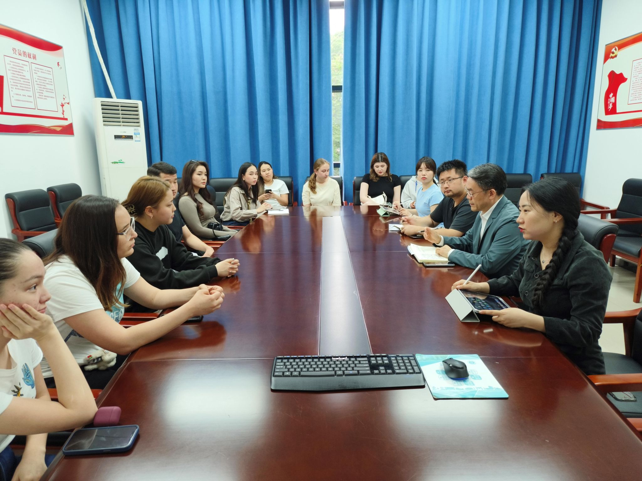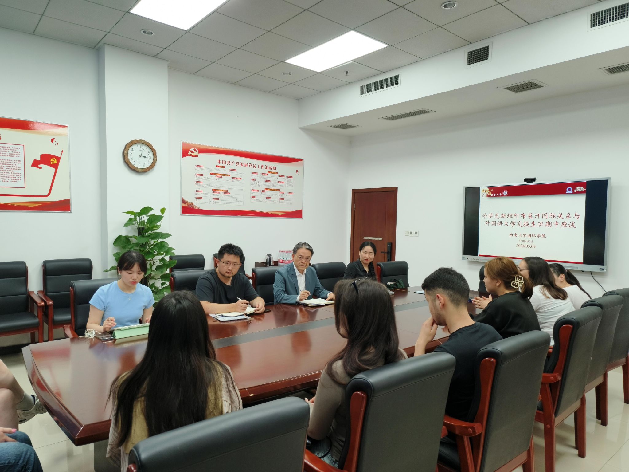5月9日下午,哈萨克斯坦阿布莱汗国际关系与外国语大学(简称“阿大”)交换生班期中座谈会在太阳成集团tyc122cc紫云楼304会议室举行。国际公司党委书记刘猛,招生办公室主任黄无为,教师代表陈雨馨,以及哈萨克斯坦阿布莱汗国际关系与外国语大学交换生班全体员工参加座谈交流。会议由班主任刘妍芩主持。