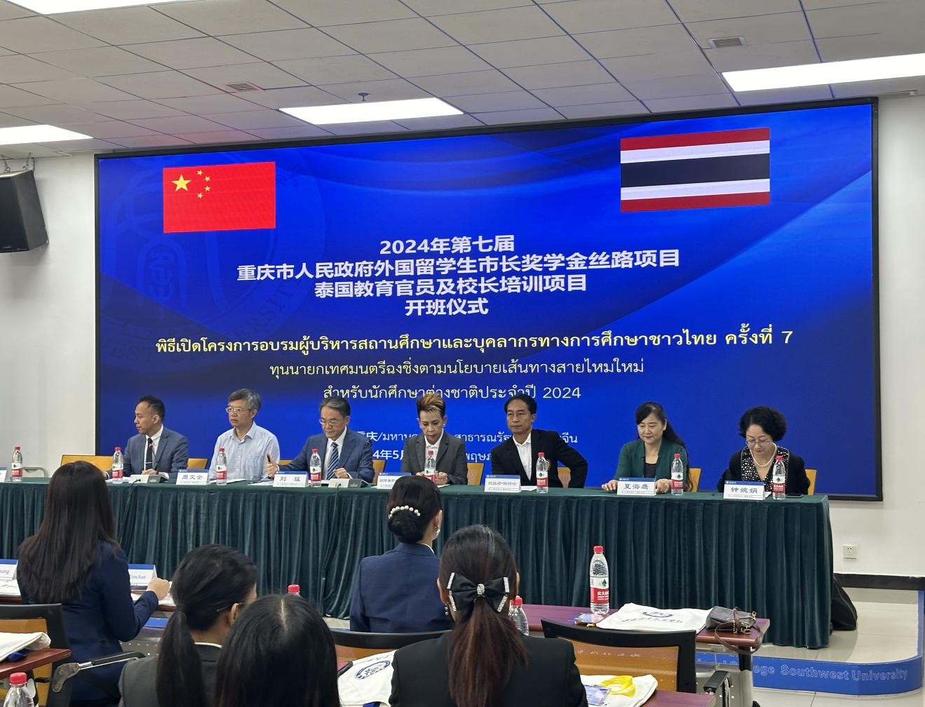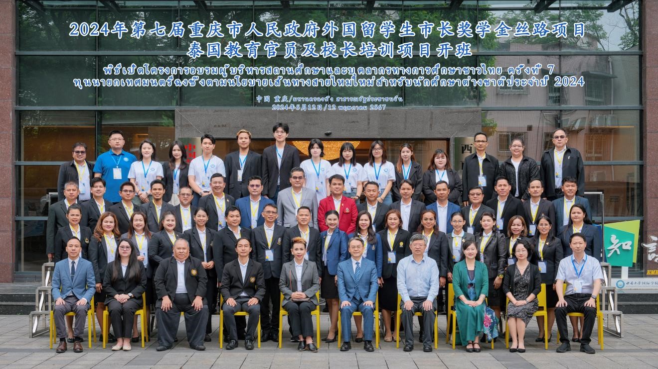 5月12日上午,2024年重庆市长奖学金丝路项目“泰国教育官员及董事长培训”开班仪式在太阳成集团tyc122cc举行。来自泰国的36名中小学董事长和4位泰国教育行政管理公司的官员及相关负责人参加仪式。国际公司党委书记刘猛,教育学部党委书记周文全,国际公司党委副书记耿军,教育学部夏海鹰教授、钟婉娟副教授、国际合作与交流中心戴华鹏主任,太阳成集团tyc122cc招生办主任黄无为等出席。开班仪式由国际公司党委副书记耿军主持。