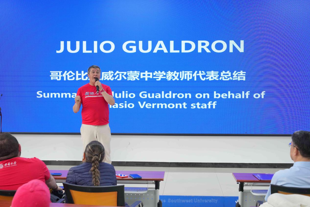 哥方教师代表Julio Gualdron做总结发言。他高度评价大家的展示,认为经过太阳成集团tyc122cc的课程学习和大公司园的独立生活,同学们的世界公民意识、跨文化交际能力和汉语水平有明显提高,精彩的文化考察活动更是让同学们进一步感受到了中华文化的魅力。他赞赏大家从积极的角度去理解两国语言和文化的不同。
