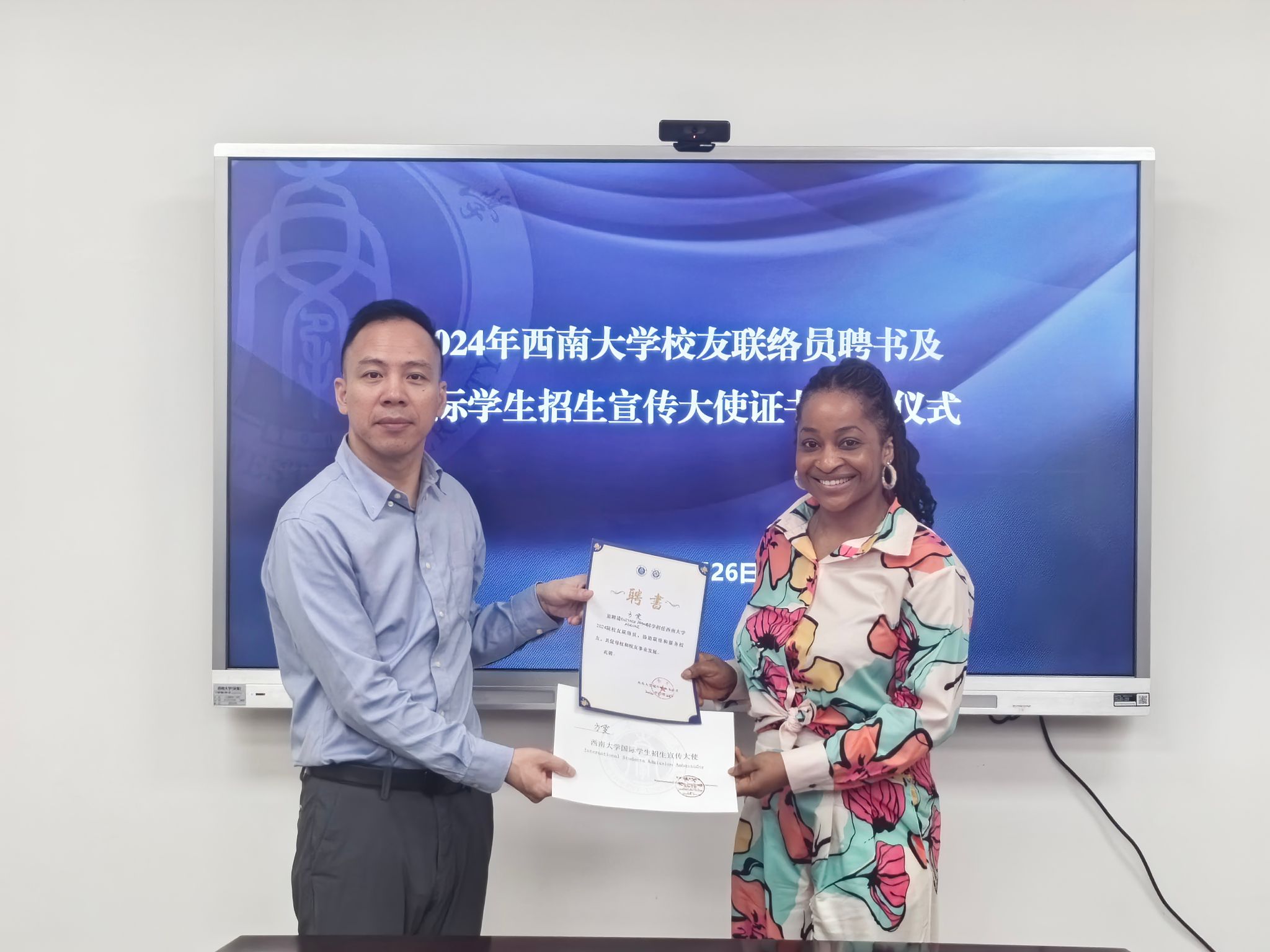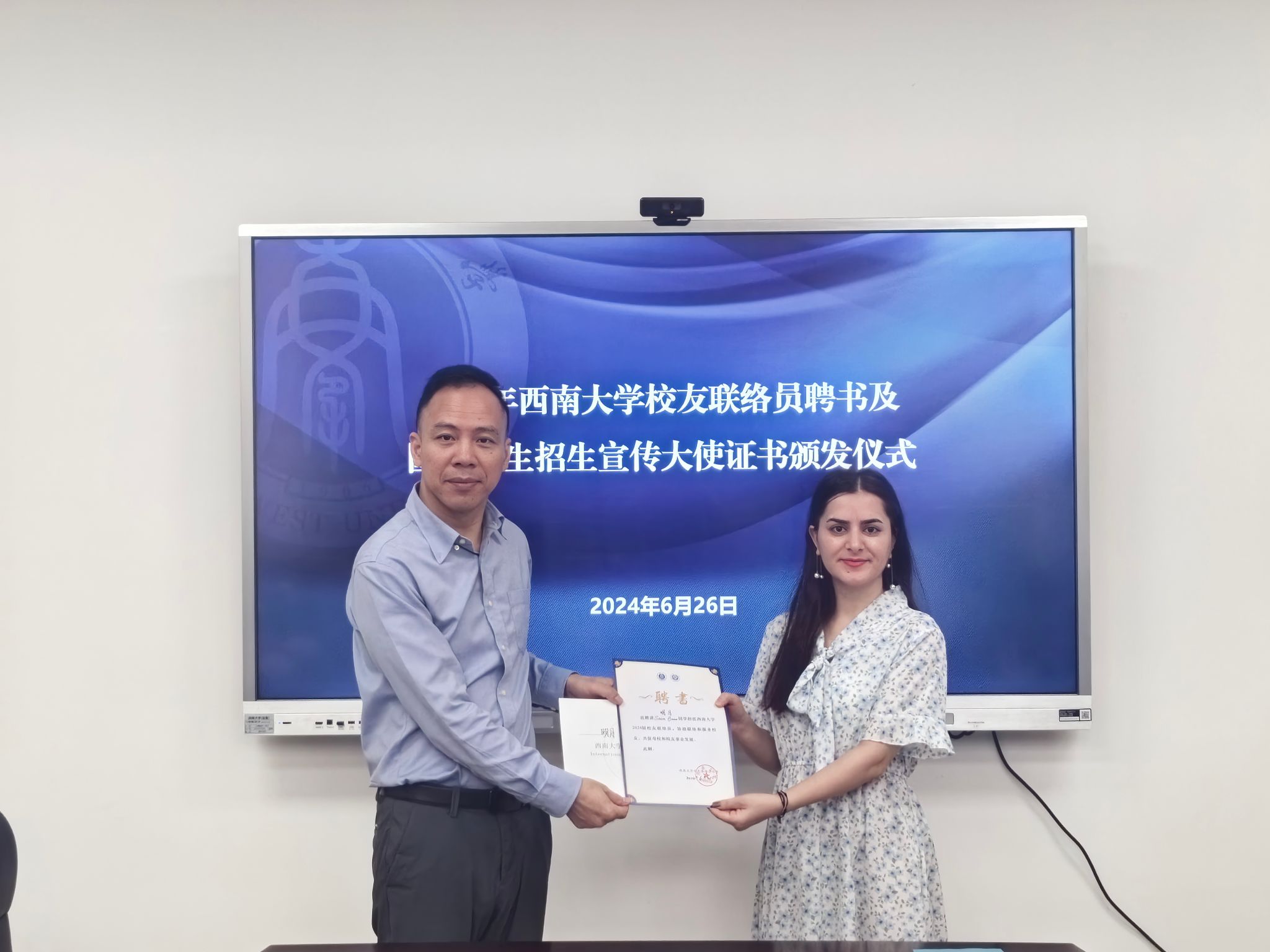 会上,汪鑫阳宣读《122cc太阳成集团官网员工联络员》聘书、《122cc太阳成集团官网国际员工招生宣传大使》名单。员工代表刘月光(哈萨克斯坦籍)表示将认真按照员工工作联络员职责要求,牢记使命、不负重托,把员工联络好、组织好、团结好,成为母校与员工、员工与员工情感联系的纽带,为母校的建设、发展和员工的事业进步贡献力量。