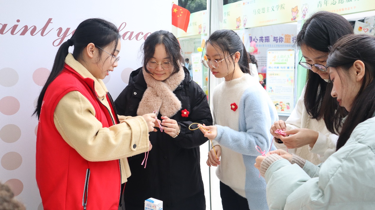 一枚枚小小的中国结,带领我们见证中外人民美好互助的深厚情谊。活动还未开始,便有两名中国同学跃跃欲试。志愿队成员拿起手边的红绳耐心地开始分步教学,有的用熟练的中文辅助动作演示,有的努力克服语言障碍,做到无声的手把手“保姆级”教学。不少参与者感慨,“这真是一次新奇又有趣的体验,外国人教我做中国结!”“虽然我们语言不通,但是这并不妨碍我们的交流,他们的志愿者精神解决了所有问题。”……制作台上的中国结颜色多样,台下的外国志愿者与中国参与者肤色各异,“咔嚓——”让我们定格这一人相交、心相通的瞬间!