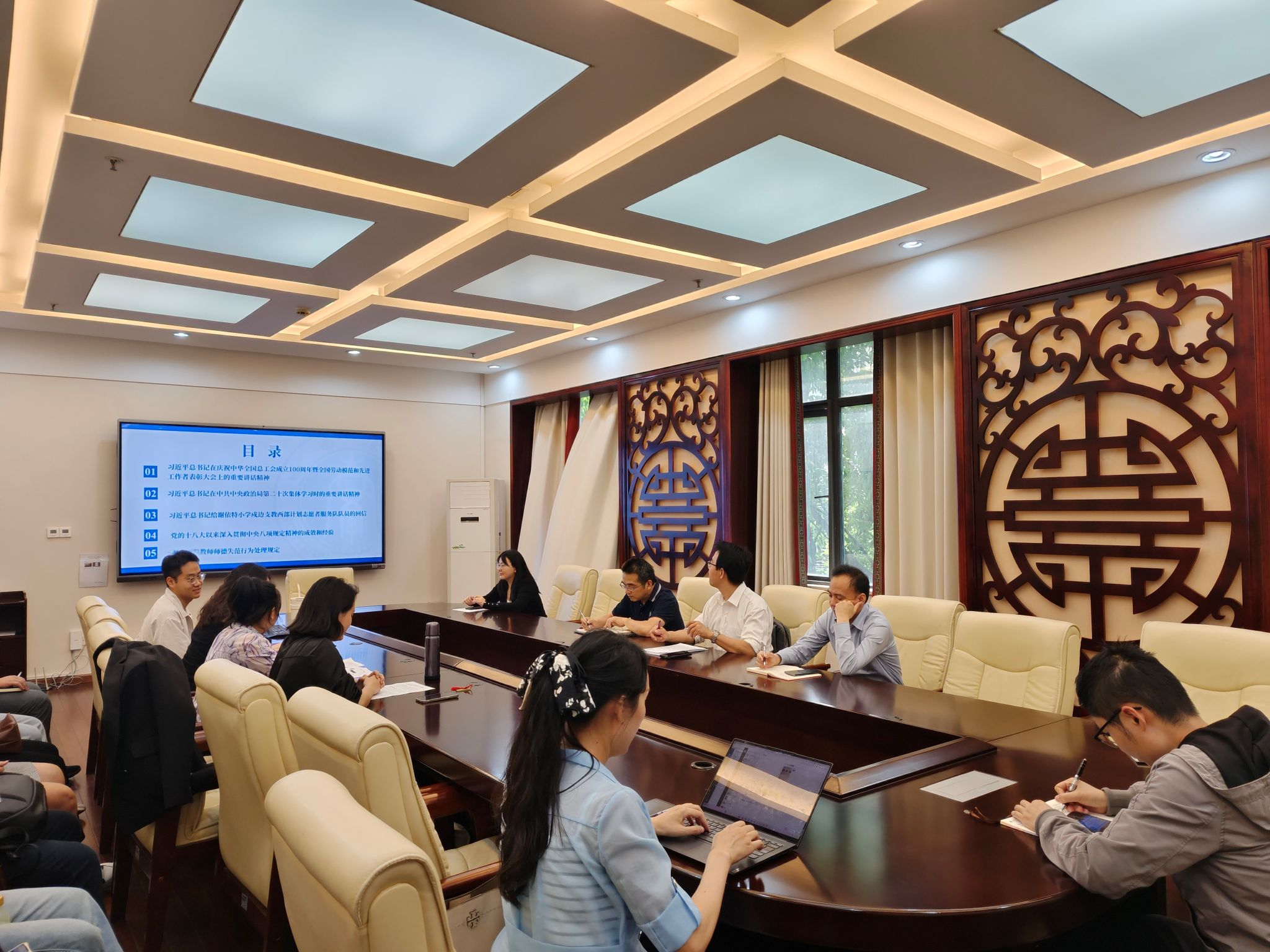 杨凌霄老师通过视频和讲解相结合的方式,带领大家学习了《习近平总书记在庆祝中华全国总工会成立100周年暨全国劳动模范和先进工作者表彰大会上的重要讲话精神》。作为公司工会主席,她结合工作实际分享心得体会,强调工会工作要发扬劳动精神,以"服务小家,链接大家"为宗旨。她表示,工会始终致力于服务教职工需求,此前已成功协调解决教职工子女入学问题,并精心打造了"游巴蜀风"等品牌活动。未来,工会将继续以这些成功经验为基础,不断创新服务形式,持续优化教职工文化生活品质,进一步增强团队凝聚力和归属感。