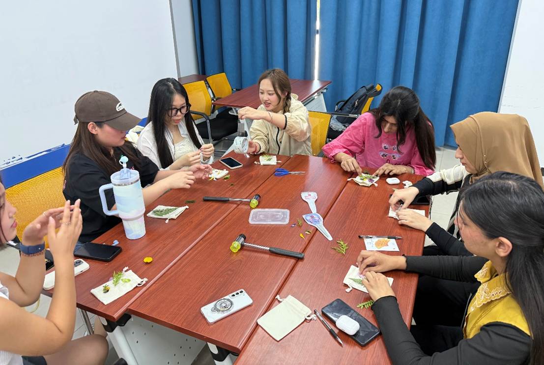 活动伊始,负责人为大家说明团体规范,带领各成员宣读团体契约,并将所有成员分为四个小组,活动在相互尊重和友好信任的氛围中展开。古有“折柳送别”,以“灞桥风雪”暗藏依依惜别;今有“草木留痕”,以拓印创作述说不舍留恋。各成员通过了解中国传统文化中“折柳送别”的故事与意境,在负责人与志愿者的协助下,将柳叶融入自己的拓印图案进行设计,一幅幅饱含巧思的个性图案,以草木为媒生动诠释着毕业心绪的千般况味。