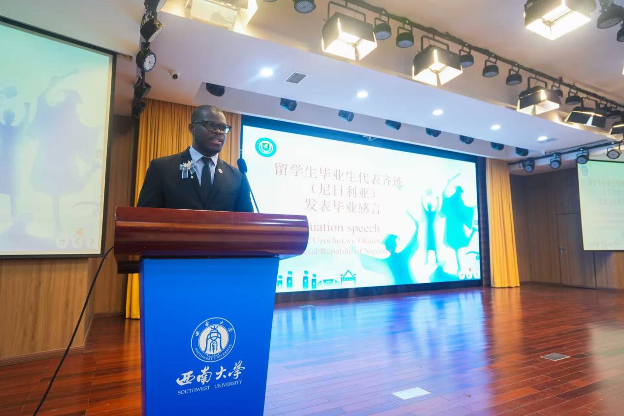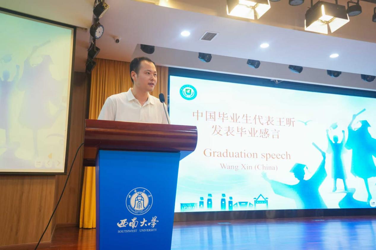 毕业感言环节,中外毕业生代表王昕与齐迹接力诉说。在他们的发言中,既有初进校园时的忐忑不安,更有在包容氛围里破茧成蝶的蜕变,句句真挚话语,道尽员工与122cc太阳成集团官网双向奔赴的珍贵情谊。