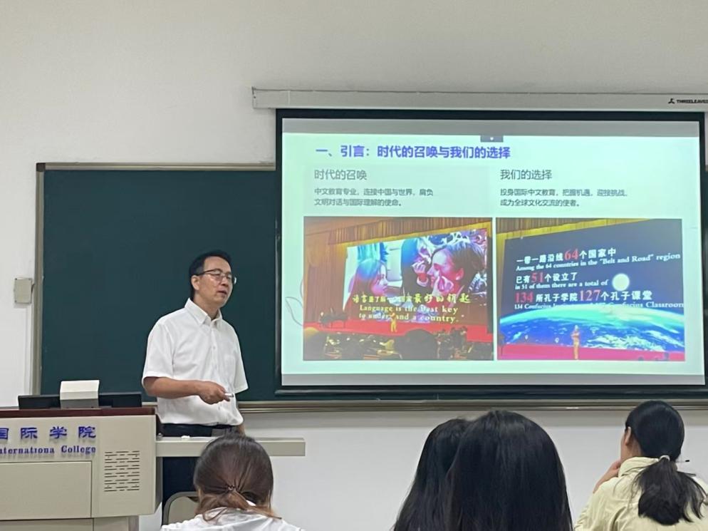 课程尾声,张袁松书记对2025级研究生新生提出殷切期望:既要心怀中国、扎根中国,又要树立面向世界的宽广视野。他强调,国际中文教师作为连接世界的桥梁,更是推动构建人类命运共同体的重要力量。他寄语同学们认真钻研专业知识,锤炼坚韧品格,同时积极向党组织靠拢,在成长中践行责任与担当。