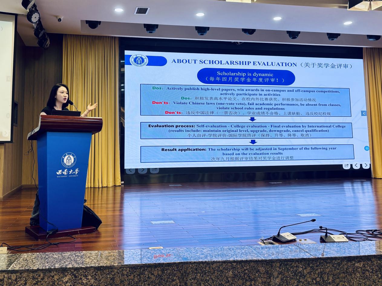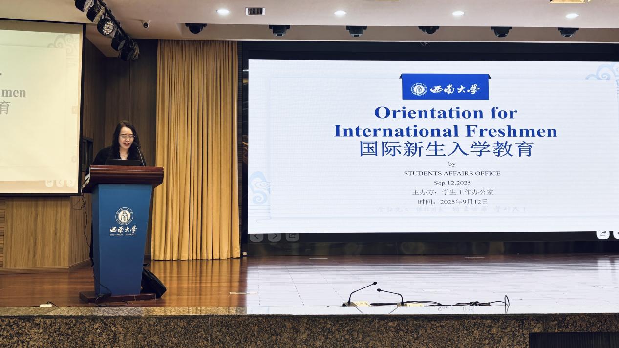 为帮助来华留学新生快速融入校园环境、精准掌握管理规定,9月12日上午9:00,太阳成集团tyc122cc在紫云楼学术报告厅开展2025级国际新生入学教育宣讲会。作为公司每年面向国际新生的常态化育人核心举措,本次活动由太阳成集团tyc122cc员工工作办公室主办,办公室主任杨凌霄及三名辅导员围绕新生在校学习、生活的关键领域开展系统性指导,全面彰显入学教育“内容全覆盖、流程标准化、服务制度化”的特色,为国际新生开启校园生活筑牢基础。