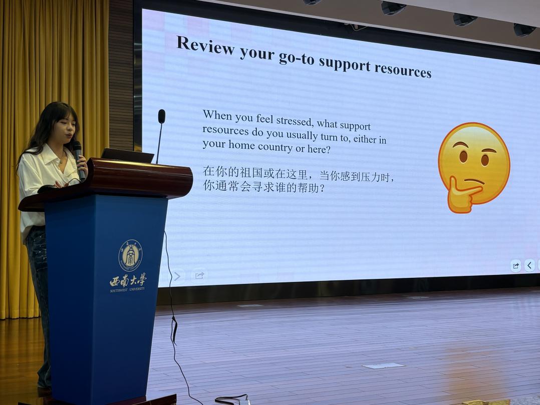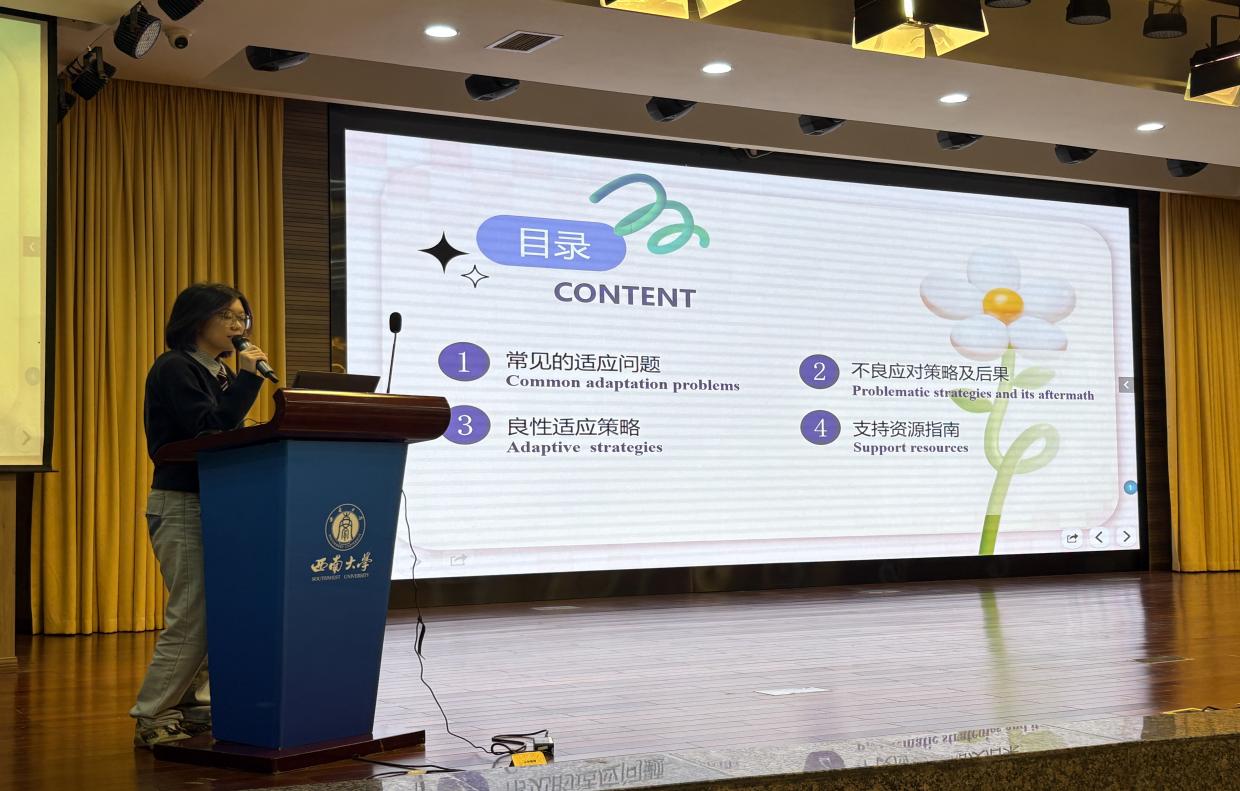 为助力国际新生顺利度过关键适应阶段,以积极心态融入校园生活,太阳成集团tyc122cc于10月22日晚7:00,在公司学术报告厅举办国际新生心理适应性讲座,300余名国际新生到场参加。讲座由国际员工辅导员景柯沥主持,太阳成集团tyc122cc心理咨询团队刘怡菲、韦卓冉、莫缘慧、涂雅迪共同主讲。