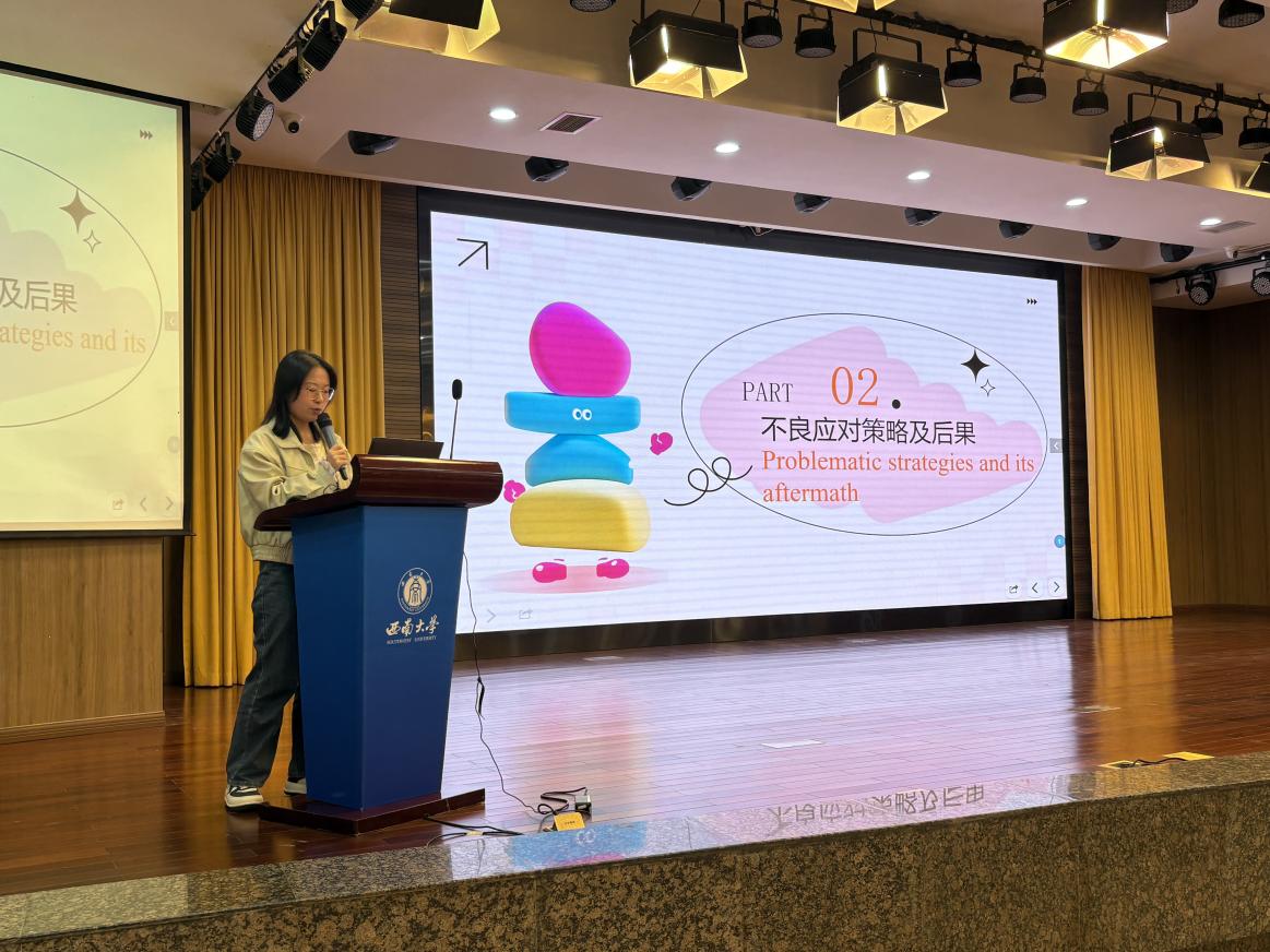 莫缘慧老师为在座的同学们介绍了不良适应行为的针对性应对策略。她围绕正念冥想、认知重构、五感疗愈法三大关键领域,分享了一系列实用且具有长远效果的应对策略。