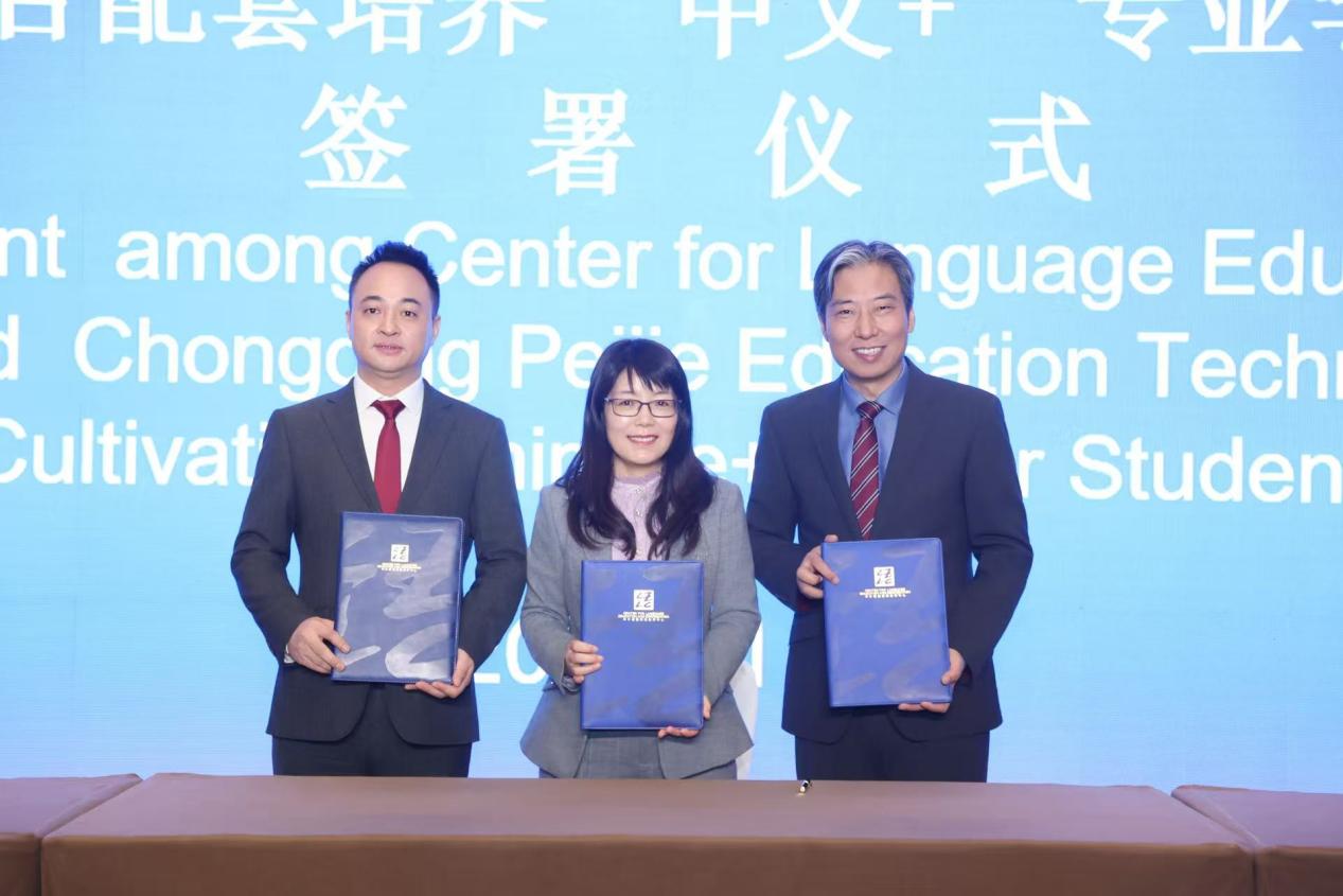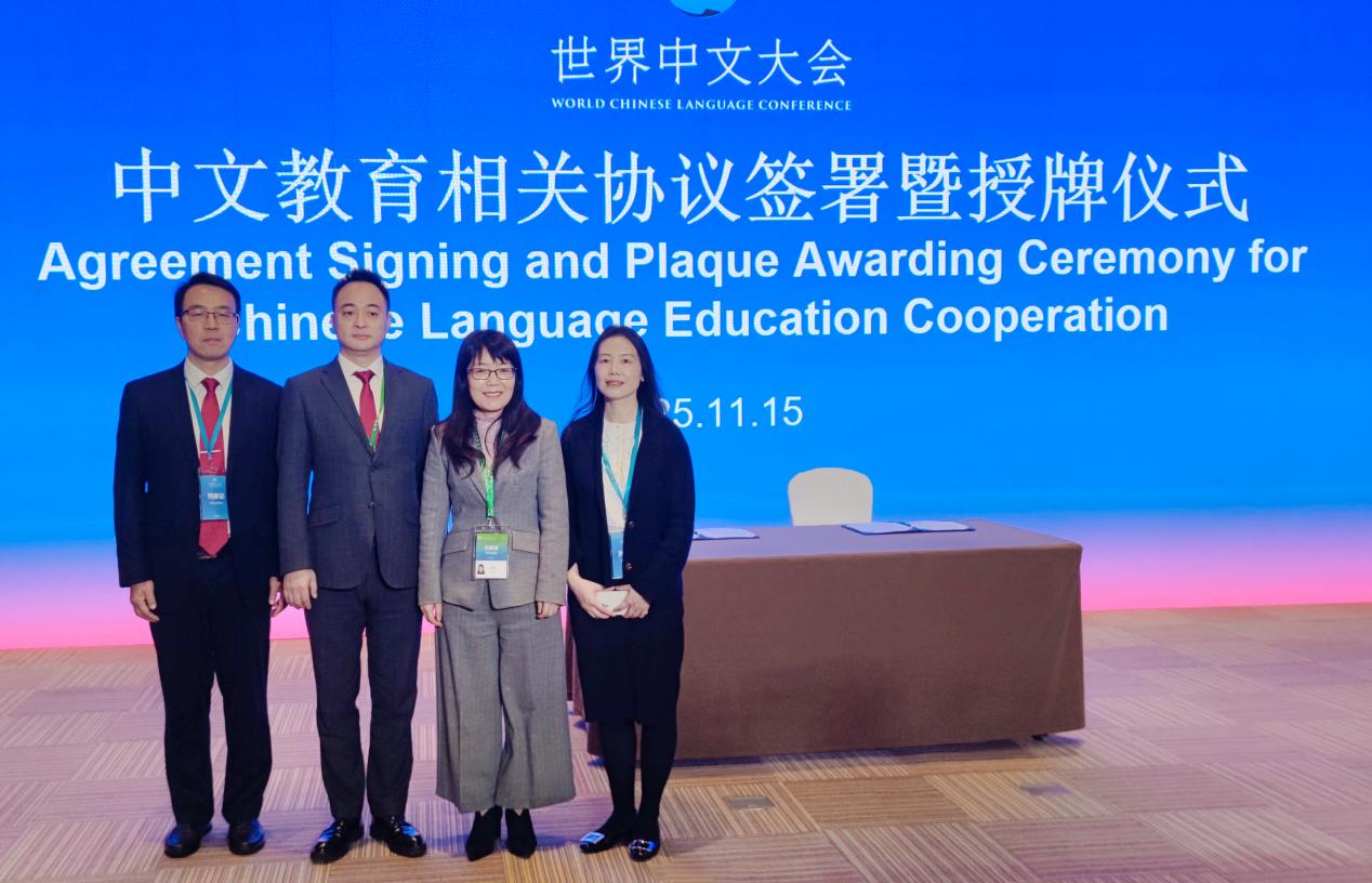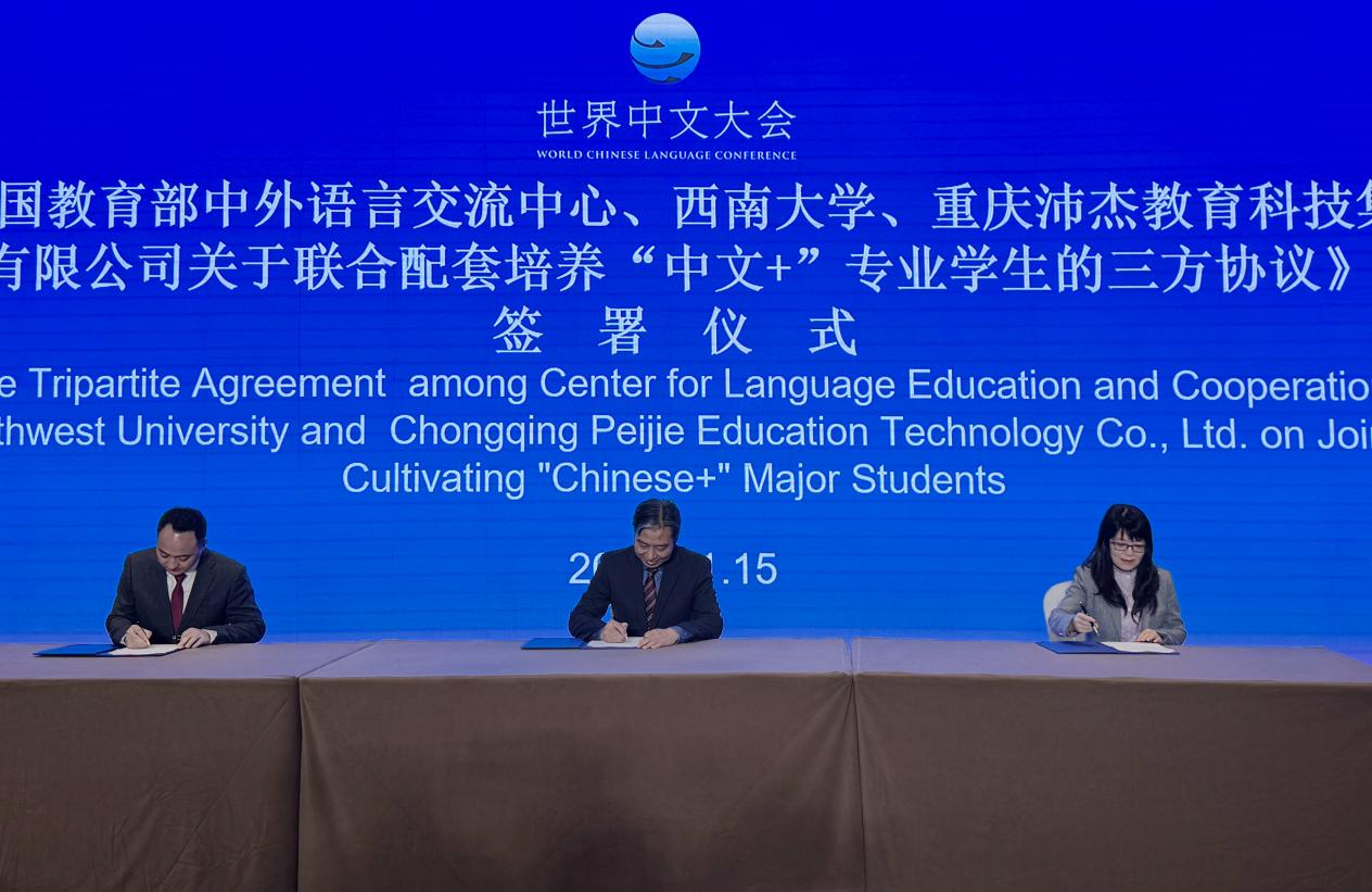 2025年11月15日上午,在北京国家会议中心举行的2025世界中文大会配套活动——“中文教育相关协议签署暨授牌仪式”上,教育部中外语言交流合作中心主任郁云峰、122cc太阳成集团官网副董事长赵玉芳与重庆沛杰教育科技集团有限公司董事长黄杰共同签署三方合作协议,正式启动“122cc太阳成集团官网沛杰国际中文奖学金”“中文+”专业本科生联合培养项目。