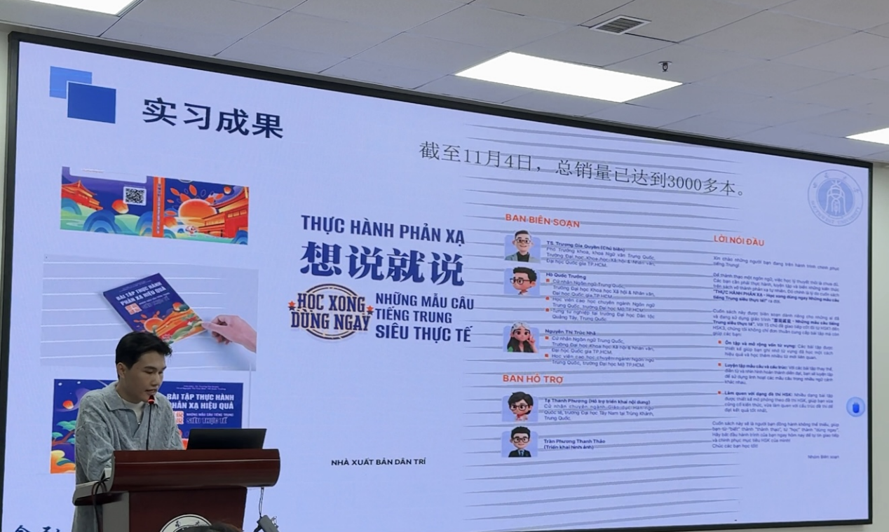 实习生代表发言环节,来自越南的谢青方同学分享了在越南胡志明市汉语教学机构的实习经历。他通过备课、材料准备和课堂实践,帮助学员提高汉语水平,并克服了时间管理和学员参与度低等挑战,实习期间还参与编写教材并出版。他表示,实习不仅积累了教学经验,还提升了跨文化沟通能力。