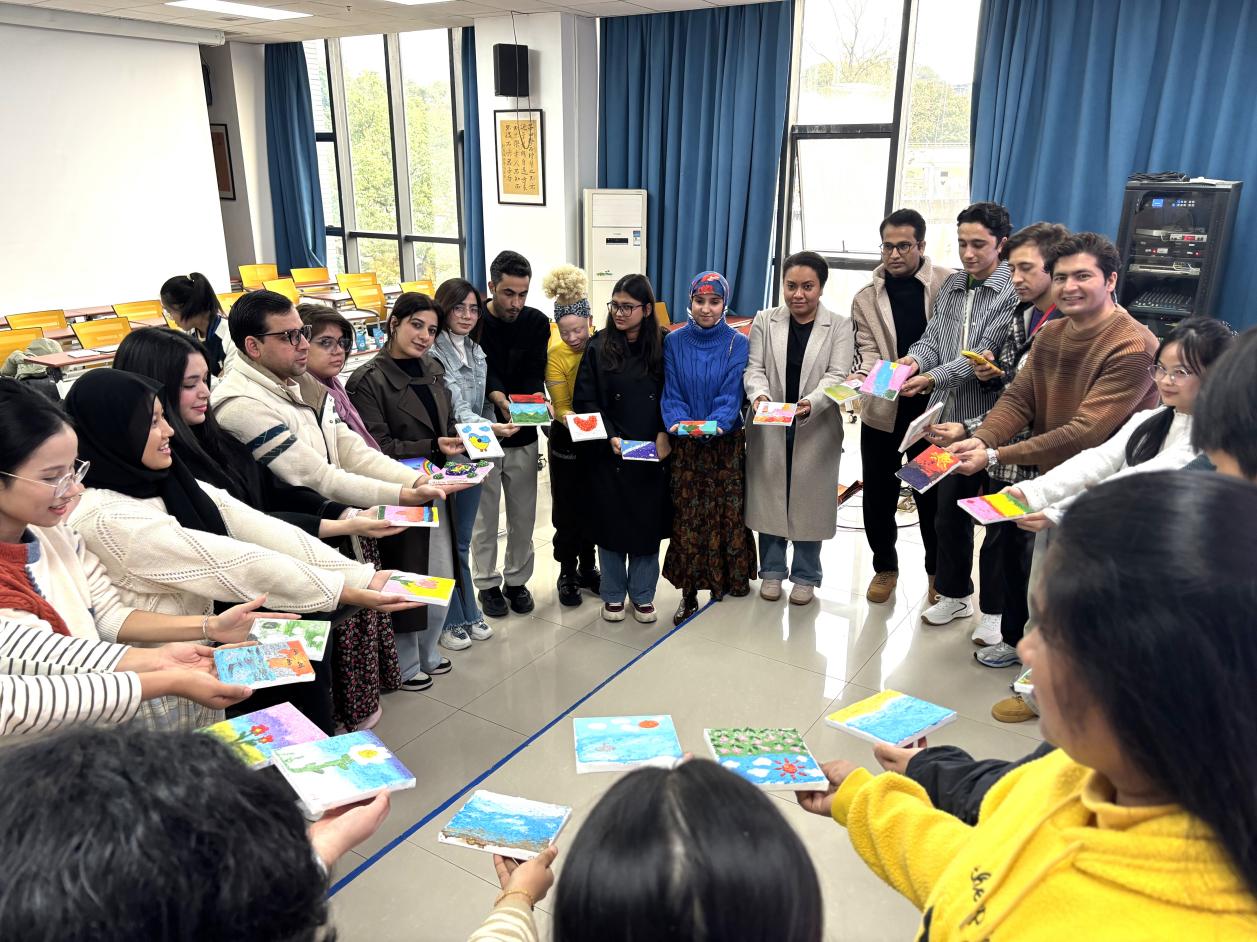 凝聚跨文化同伴情谊、传递活动感悟,各小组均选派一名代表上台分享。有代表提及“从初入活动时的陌生拘谨,到借砂画创作逐渐敞开心扉的放松”,也有代表感慨“倾听不同国家同学的故事时,意外找到了跨越文化差异的情感共鸣”,真挚的分享引发台下同学的广泛认同。