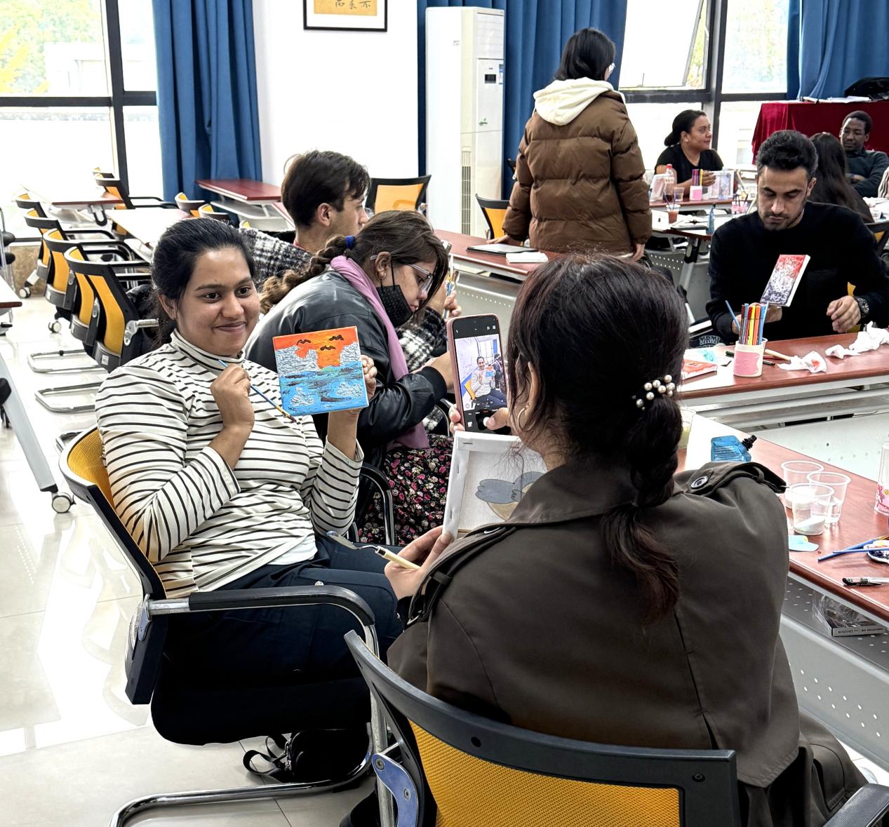 “用心聆听、不评判”,在主持人刘怡菲带领国际员工宣读团体活动规范之后,此次团辅活动的第一环节“邻色诉心”正式开始。在轻柔舒缓的背景音乐下,员工们纷纷选取契合当下心境的颜色,在便利贴上进行创意表达。“我叫XX,来自XX,蓝色是我此刻的平静”“我画的橙色,恰似家乡阳光,满是活力”,接龙式的自我介绍取代传统寒暄,色彩化作跨文化沟通的专属名片。望着彼此笔下的线条色块,员工们在轻松交流中打破陌生壁垒,初步缔结情感联结,教室中回荡着欢声笑语。
