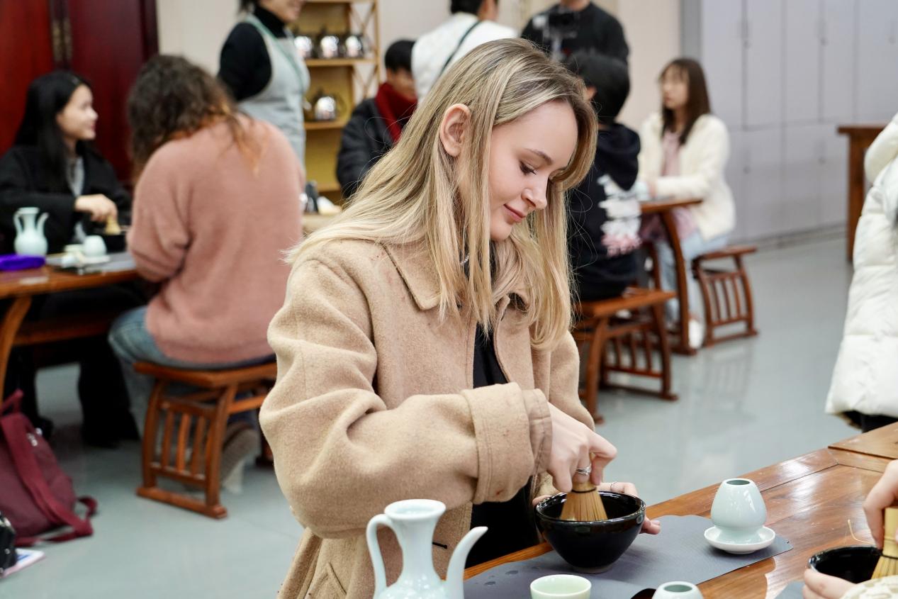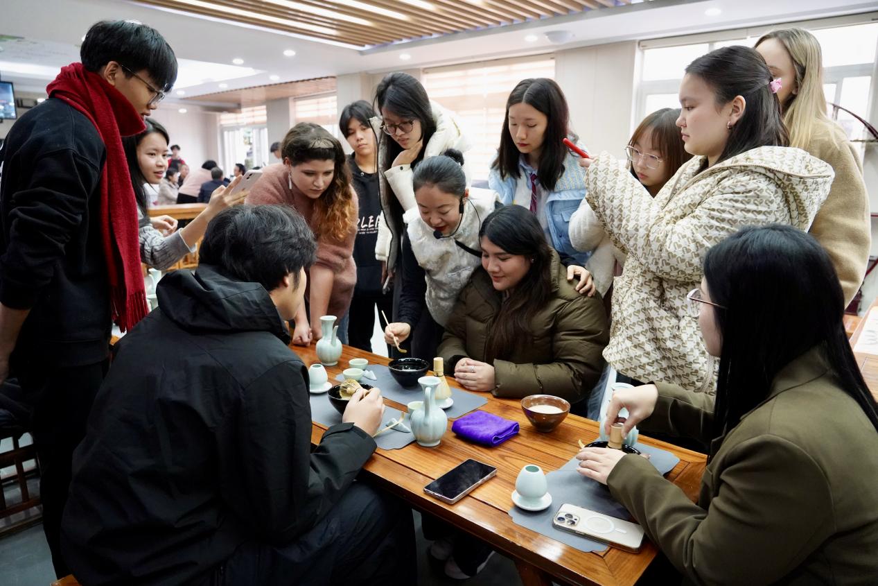 仪式结束后,全体人员在实训楼前合影留念。随后,国际员工们分为两组,分别体验了独具特色的非遗文化项目:在茶艺实训室,同学们学习宋代点茶技艺,亲手击拂茶汤、绘制茶沫图案;在工艺体验区,大家尝试传统漂漆扇制作,感受大漆艺术流动变幻之美。不同项目的沉浸式体验,让各国学子在动手实践中加深了对中华文化的理解与情感共鸣。