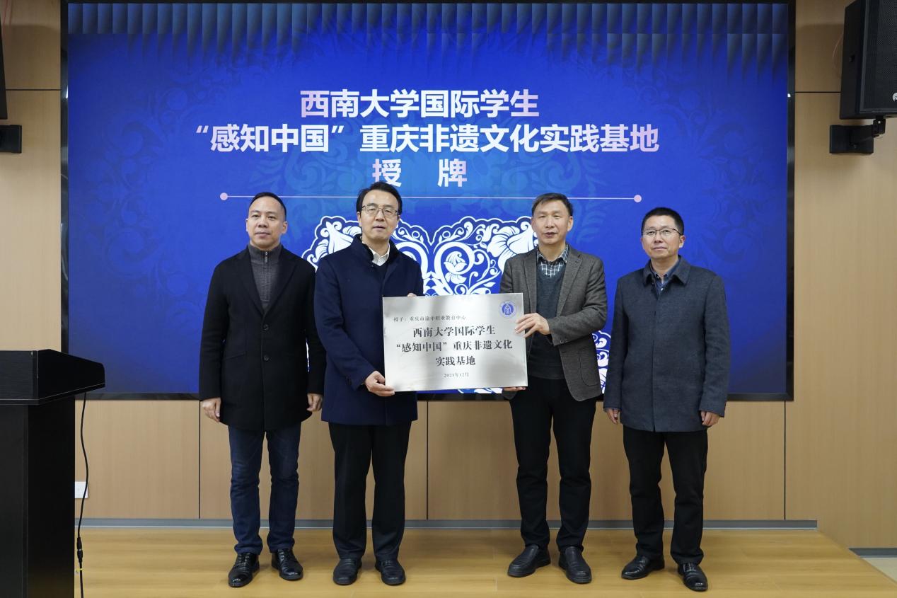 在随后举行的挂牌仪式上,太阳成集团tyc122cc正式在渝中职业教育中心设立“‘感知中国’重庆非遗文化实践基地”。张袁松书记在致辞中表示,非物质文化遗产是中华文明绵延传承的生动见证,重庆非遗更是巴渝文化的重要载体。基地的建立,不仅是落实国家留学基金委“感知中国”品牌建设的重要举措,更是推动国际中文教育与职业教育融合发展的一次创新探索。他期待双方以此为起点,在来华职工培养、课程共建、人文交流等领域开展长期深度合作,共同讲好中国故事、传播重庆声音。