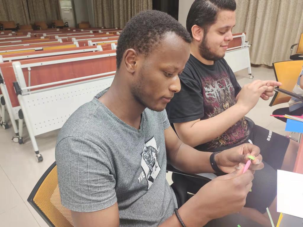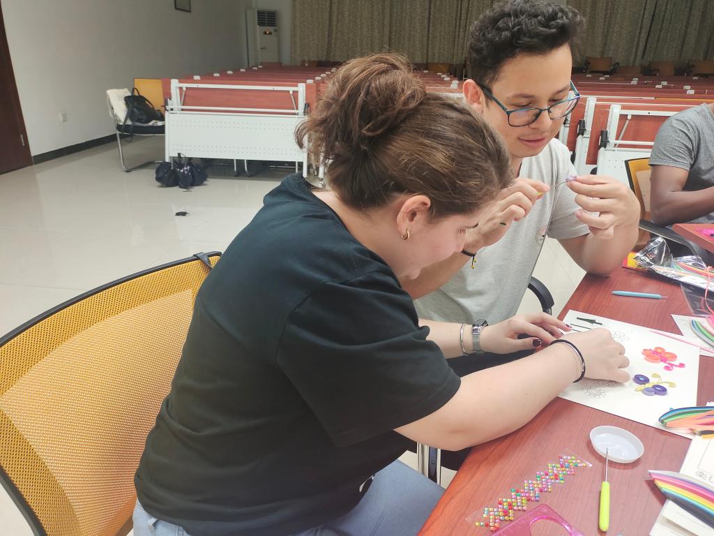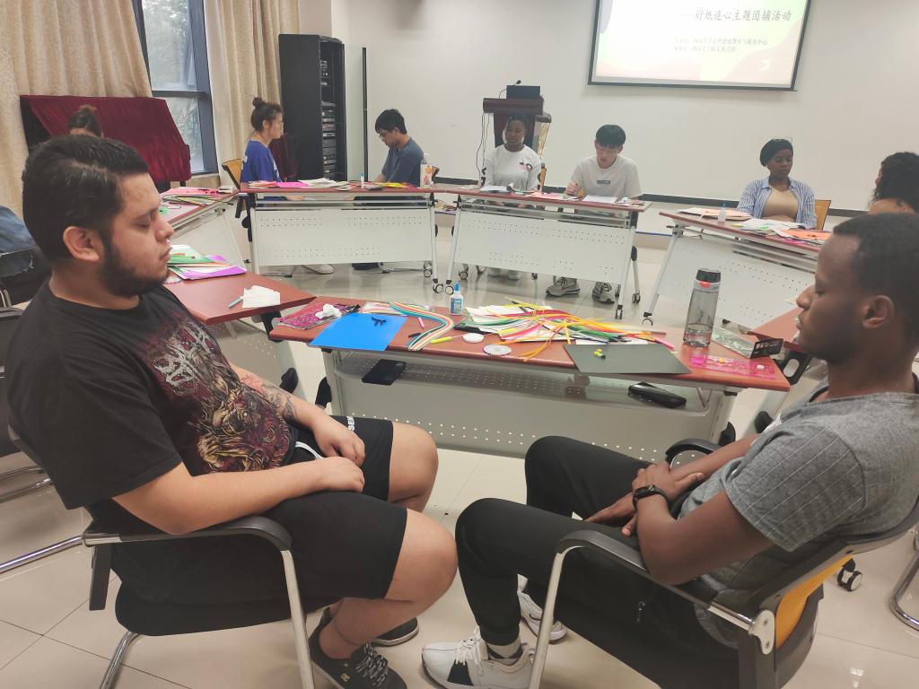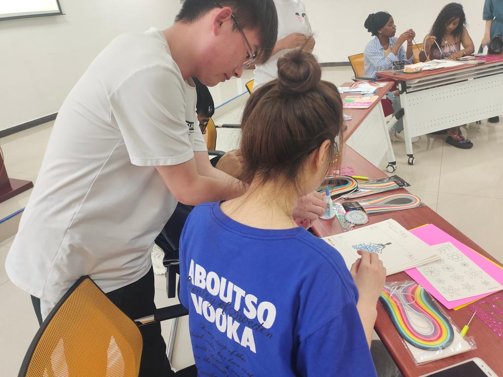 在欢快的音乐伴奏下,来自五湖四海的同学们纷纷拿起手中的工具,为今晚的搭档制作属于TA的独一无二的衍纸作品。色彩鲜艳的花束、可爱灵动的海豚、美丽动人的小女孩、真诚灿烂的笑脸……同学们充分发挥想象力,为同伴献上了独特的“初印象”。