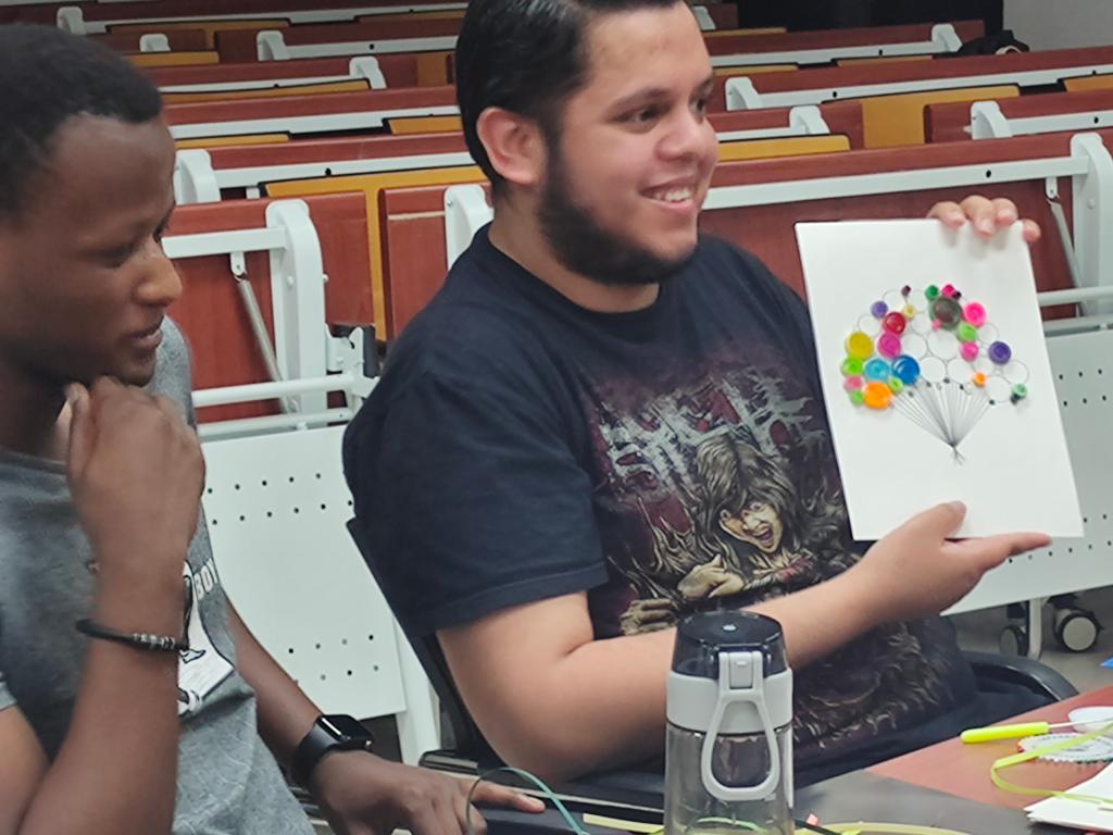 在分享作品环节,大家骄傲地举起和搭档共同制作的“半成品”,向其他同学介绍选图原因、颜色搭配设计以及制作感受