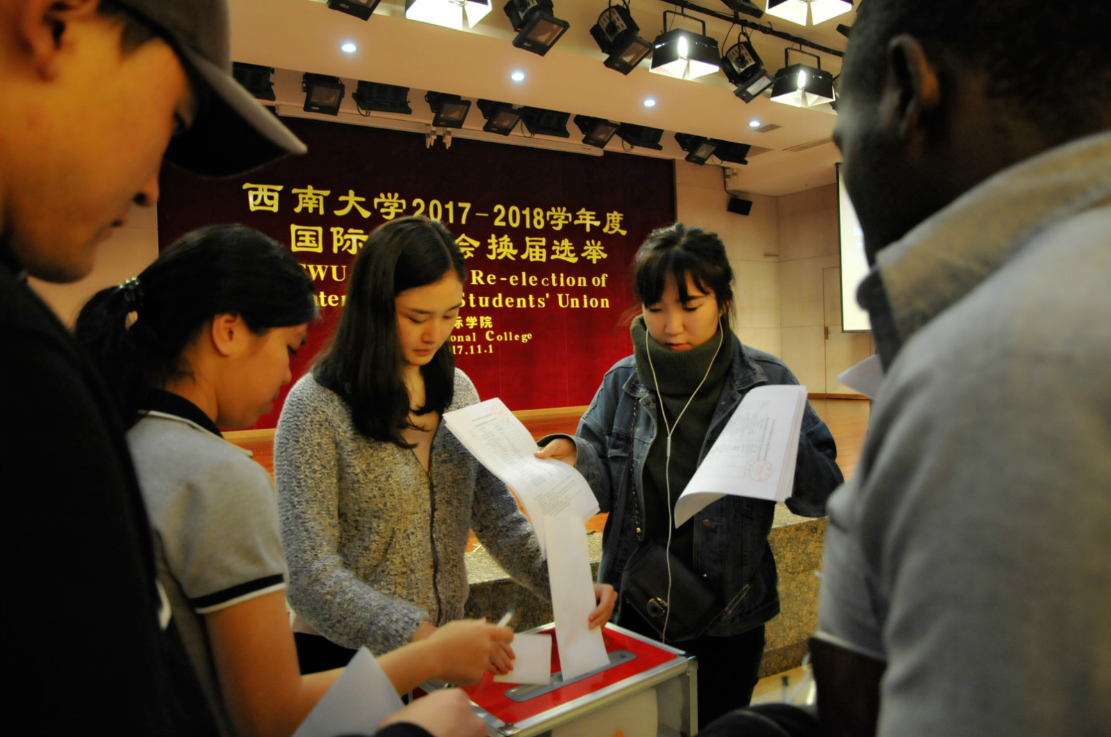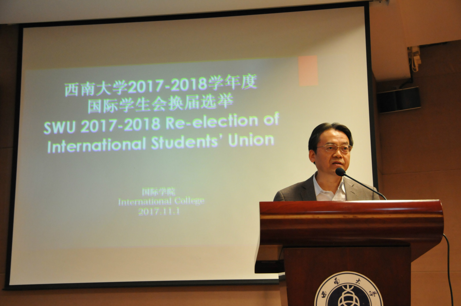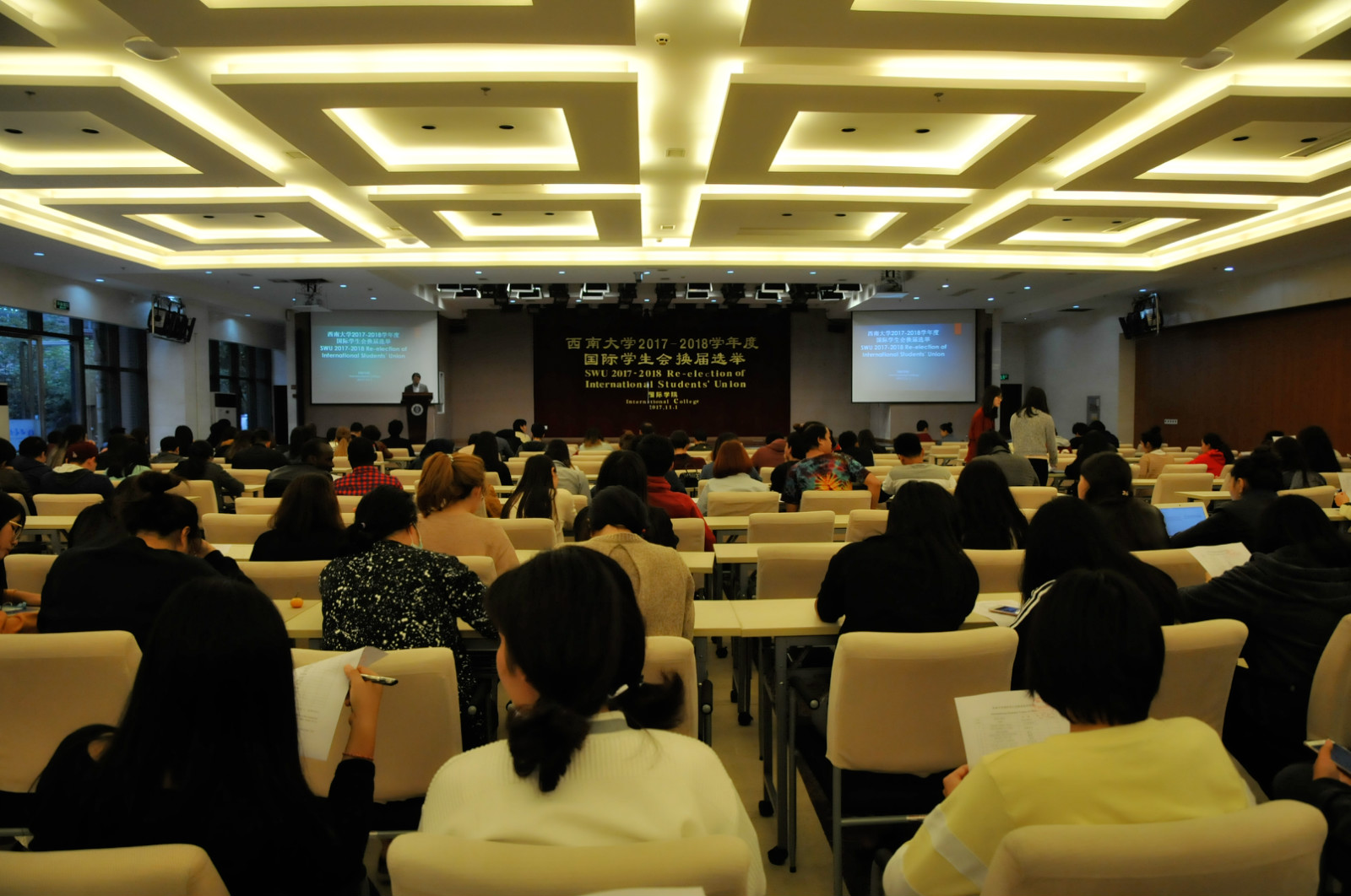 11月4日下午四时三十分,2017-2018学年度122cc太阳成集团官网国际员工会换届选举大会在太阳成集团tyc122cc报告厅举行。来自12个国家的19名候选人就新一届国际员工会的主席、副主席和秘书等职位展开竞选。国际公司党总支书记刘猛,公司员工工作办公室老师及全校300余名国际员工参加选举会。