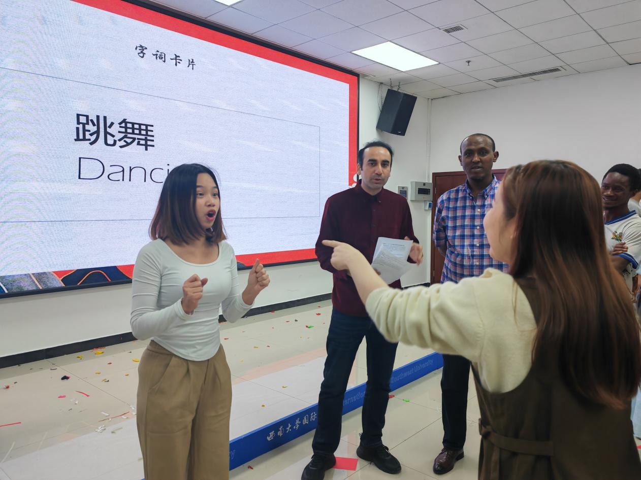 小组成员竖队排列,后一成员向前一成员进行肢体动作演绎,规定时间内猜出词语最多的队伍获胜。“银行”一词出现时,比划的同学先做出取钱的动作,再做出数钱的动作,旁边的同学瞬间领会,恨不得自己去猜。