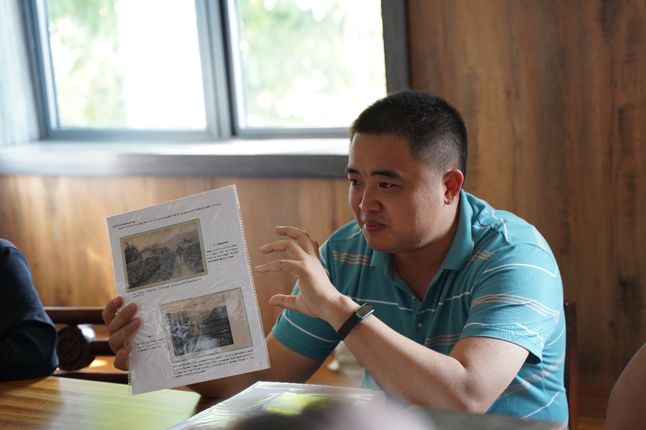 缙云甜茶分布在缙云山山脊一带,每年可采摘三次,产量极少,由于常年受缙云山良好的自然环境滋养,其微量元素种类与含量远超其他茶钟。同时,经过炒制后冲泡出的茶汤金黄透亮,口感回甘不腻,具有一定的养生健体之效,是集“药、茶、糖”于一体的茶中佳品。来自西大茶厂的刘波老师不仅在登山沿途结合随处可见的茶树给同学们详细介绍甜茶的采摘、加工与功用,也与大家分享了茶箱、茶画等个人藏品并通过108张茶文化明信片向同学们展现了百年间茶叶的流传与发展。