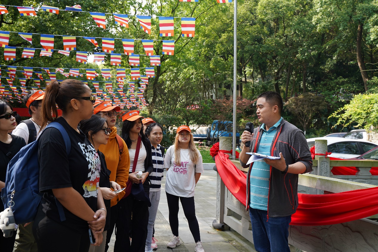 北温泉北濒嘉陵江,南倚缙云山,而活动正是在与缙云山北温泉比邻而居的温泉寺拉开了序幕。柏林楼址,东方神韵;洛阳桥下,锦鲤游动;黄墙灰瓦,红绸祈愿;五龙壁泉,气势恢宏。在刘波老师的详细讲解下,大家共同领略到了千年古寺——温泉寺的独特魅力。同样作为蜀中三大道教名山之一的缙云山,也拥有着西部地区最大的正一派道观——绍龙观。绍龙观前临幽静的鉴湖,背靠祥云翠峰,同学们在松风竹韵中体悟“静虚则明”的道家玄机。