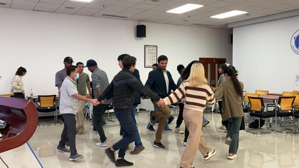 同心同向聚共识、合力合拍促学进。全场同学分为内、外两圈,呈同心圆状随着音乐转圈跳舞。背景音乐暂停后,面对面的两位同学便可互相自我介绍,开启友谊之旅。“同心圆”寓意为团结、包容、融合、共识,象征为圆满、美好、共享,在今天也代表着世界各地的职工对“留学西大”品牌的深度信赖。