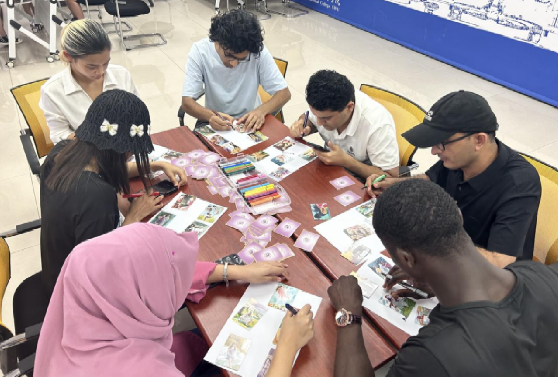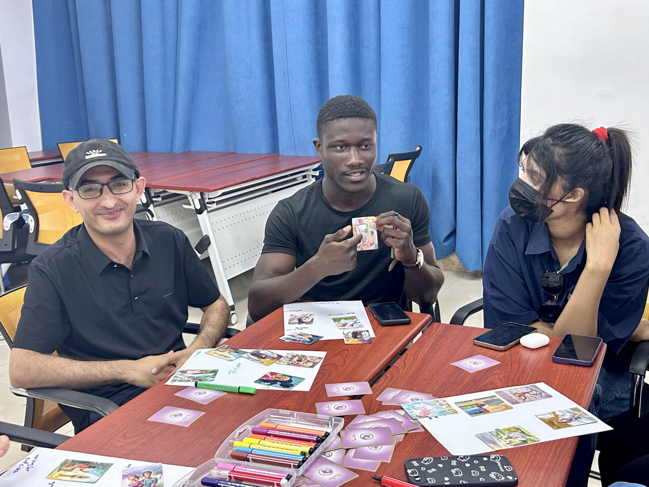 在社交活动多元化的今天,恋爱不再是中外青年的必选项,但与他人建立联系、进行深度交流并互相陪伴依然是必需品。“恋爱故事接力”这一环节便是为了帮助成员打破交友圈结界、学会深度沟通,成员们轮流抽取一张图卡,由第一个人开始创编故事,后面的人依次接力讲故事,直至形成一个完整的故事。成员们充分发挥想象力,通过接龙的方式,为故事增添独特的个人色彩,在表达自我的同时打开了自己、融入了新环境。