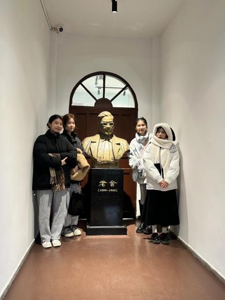 走进故居的客厅,简单古朴的陈设映入眼帘。老式的桌椅摆放有序,门口矗立着老舍先生的铜像。员工们围在一起,听着讲解员讲述老舍先生在此居住时的生活点滴。原来,在那段特殊的抗战时期,老舍先生在北碚度过了艰苦却充实的岁月,这里成为他创作的重要源泉。来自老挝的安东同学感叹道:“很难想象在那样动荡的年代,老舍先生还能坚持创作,他一定是一位非常有信念的人,他就是用辛苦磨砺自己的才华。”