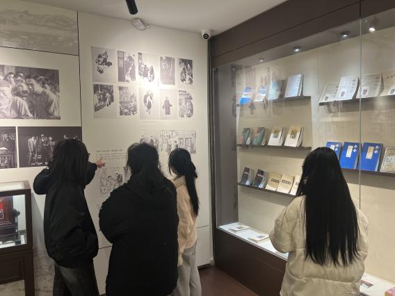 在故居的陈列室里,摆放着大量珍贵的文物和资料。有老舍先生在北碚时期的照片,照片中他与家人、朋友、文艺界同仁的画面,生动地展现了他的社交生活。员工们看着这些照片,仿佛穿越时空,看到了那个时代的文化交流场景。这时,班长尤怡铭同学指着一张老舍先生与孩子们的照片说:“从这些照片可以看出老舍先生是一个很有爱的人,他的家庭氛围一定很温暖。”陈列室里还有老舍先生的著作和相关研究资料,涵盖了多种语言版本,看来老舍先生的作品在国际上受到了广泛的关注和喜爱。