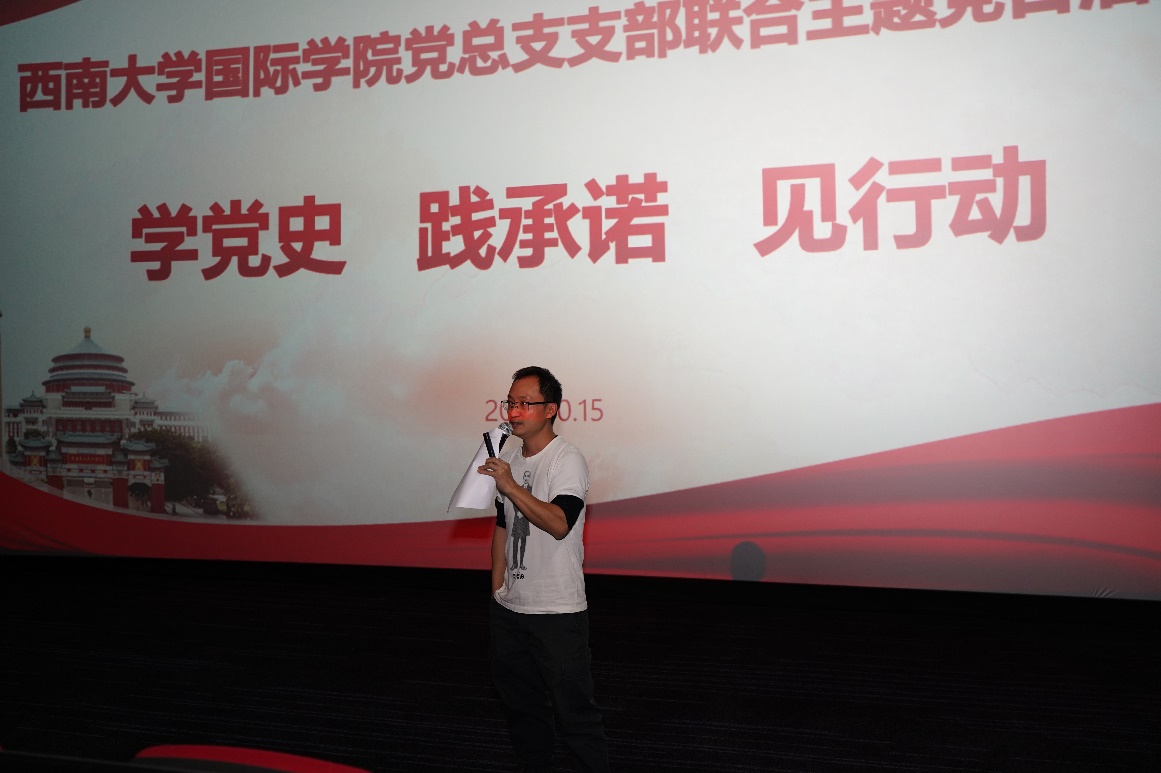 10月15日下午1点30分,国际公司党总支通过学习交流和现场观影的方式,在北碚万达影城开展主题为“学党史 践承诺 见行动”的支部联合主题党日活动。全体党员、师生代表近90人参加活动,活动由党总支委员杨昆同志主持。