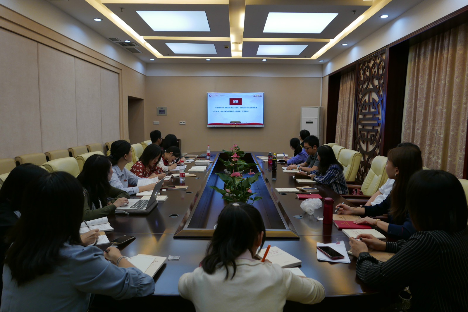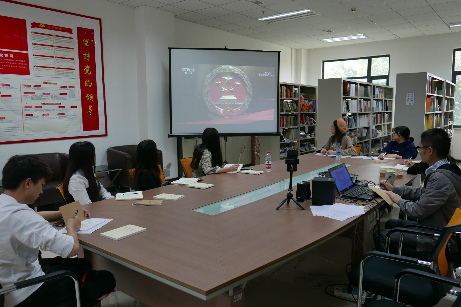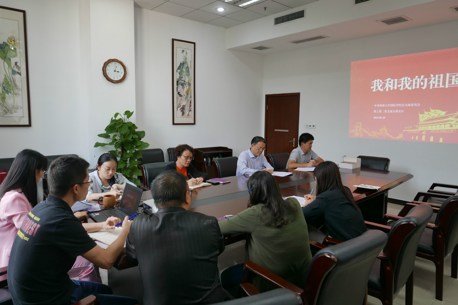 随后,大家一起观看了专题片《新中国诞生》,围绕影片和本次党日活动主题,各位同志深入开展学习交流讨论。大家都对影片颇有感触,深切感受到了建国的艰辛与建国70年来的沧桑巨变,结合自身对外汉语教师以及党员的身份,均表达了对自己的要求和目标。王湛明同志总结发言,激励各位同志把个人的成长融入到民族复兴的伟大进程之中,认真钻研专业知识,努力提高知识技能,把爱国之志变为报国之行,发扬中华优秀传统文化,用教育托起伟大的中国梦。