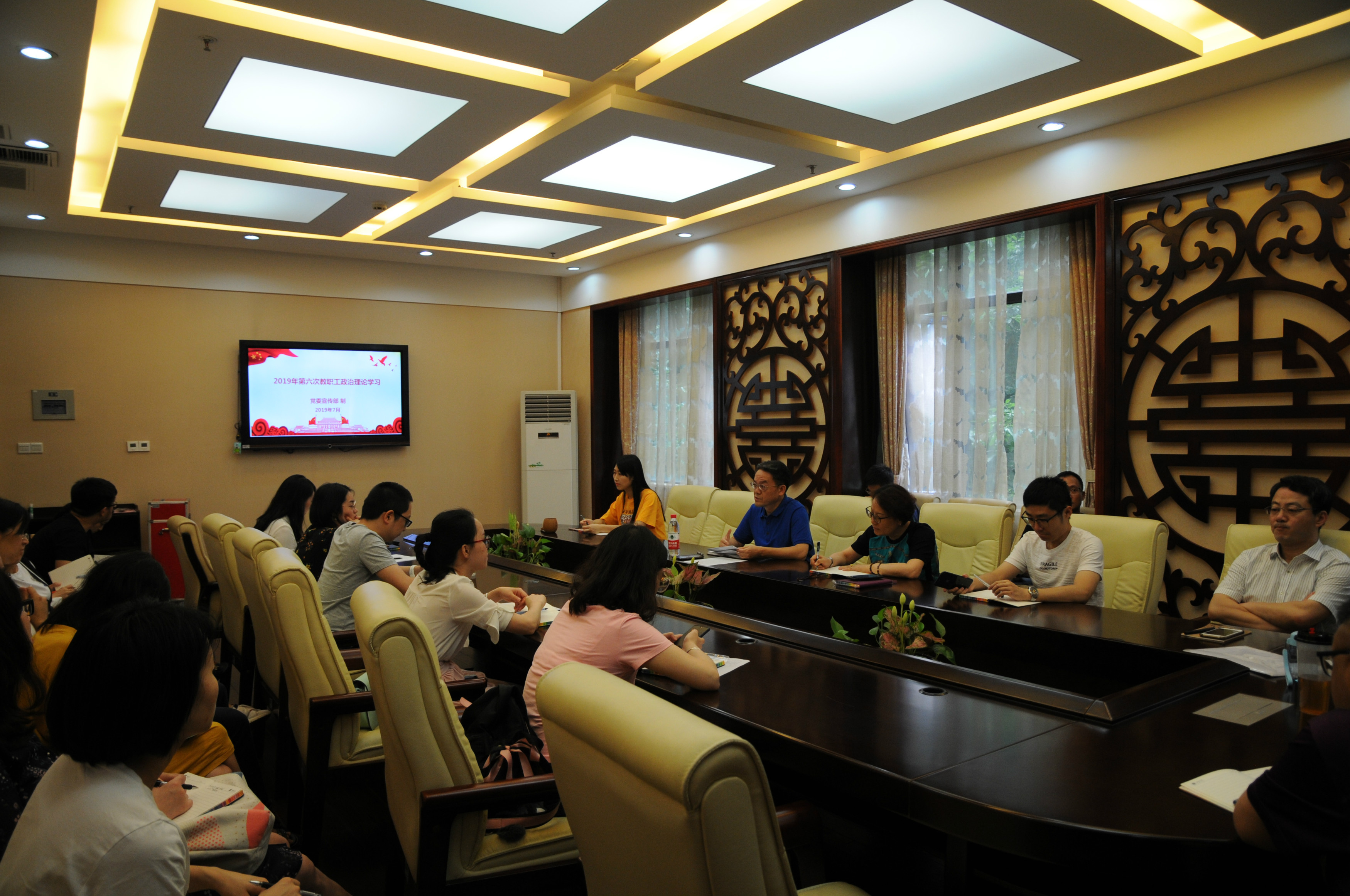 2019年7月5日下午3:00,太阳成集团tyc122cc全体教职工在紫云楼签约室开展本年度第六次政治理论学习活动。会议由刘猛书记主持。