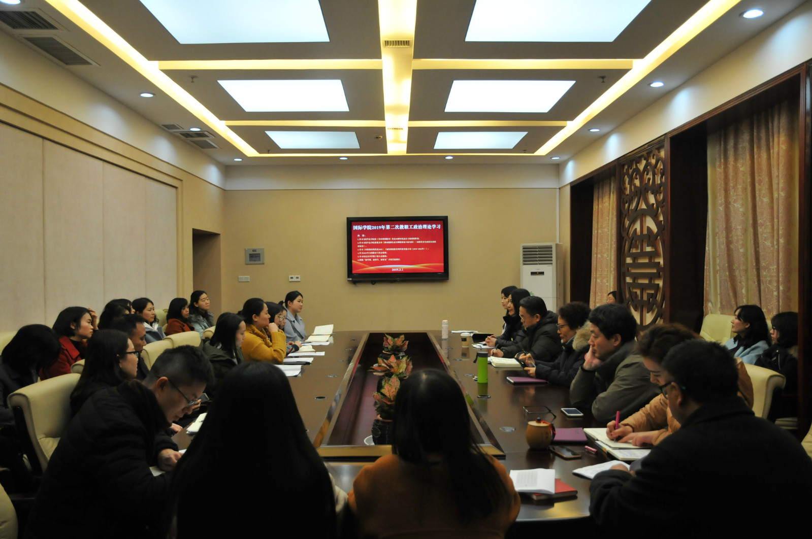 2019年3月1日下午3:00,太阳成集团tyc122cc全体教职工在紫云楼签约室开展本年度第二次政治理论学习活动。会议由刘猛书记主持。