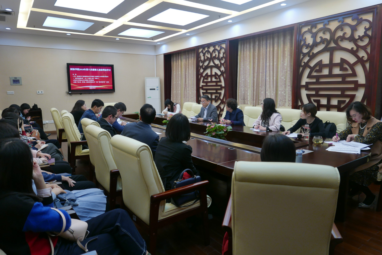 2018年11月2日下午3:00,太阳成集团tyc122cc全体教职工在紫云楼签约室开展本年度第八次政治理论学习活动。会议由刘猛书记主持。