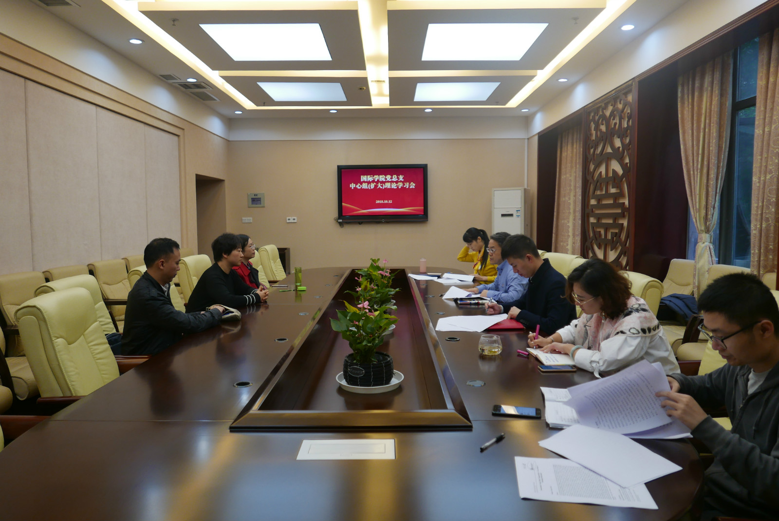 2018年10月12日下午4:00,国际公司党总支在紫云楼签约室举行中心组(扩大)理论学习会,传达公司党委有关支部建设的文件,并研究落实有关事宜。党总支委员以及各支部书记、院办主任、汉教系主任等参加学习会,会议由党总支书记刘猛主持。