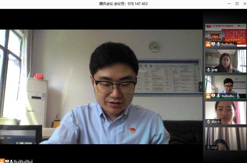 大家积极自学相关内容,为线上会议做足准备。会议包括以下议程:1.支部书记王湛明同志讲授党课,组织大家重温《中国共产党章程》;2.每位党员依次结合自学内容从“如何自觉践行党章,如何忠诚履行使命”谈责任担当;3.为五月入党的党员同志过政治生日。