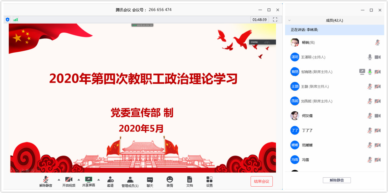 2020年5月8日下午3点,太阳成集团tyc122cc全体教职工利用线上腾讯会议平台开展了本年度第四次政治理论学习活动。