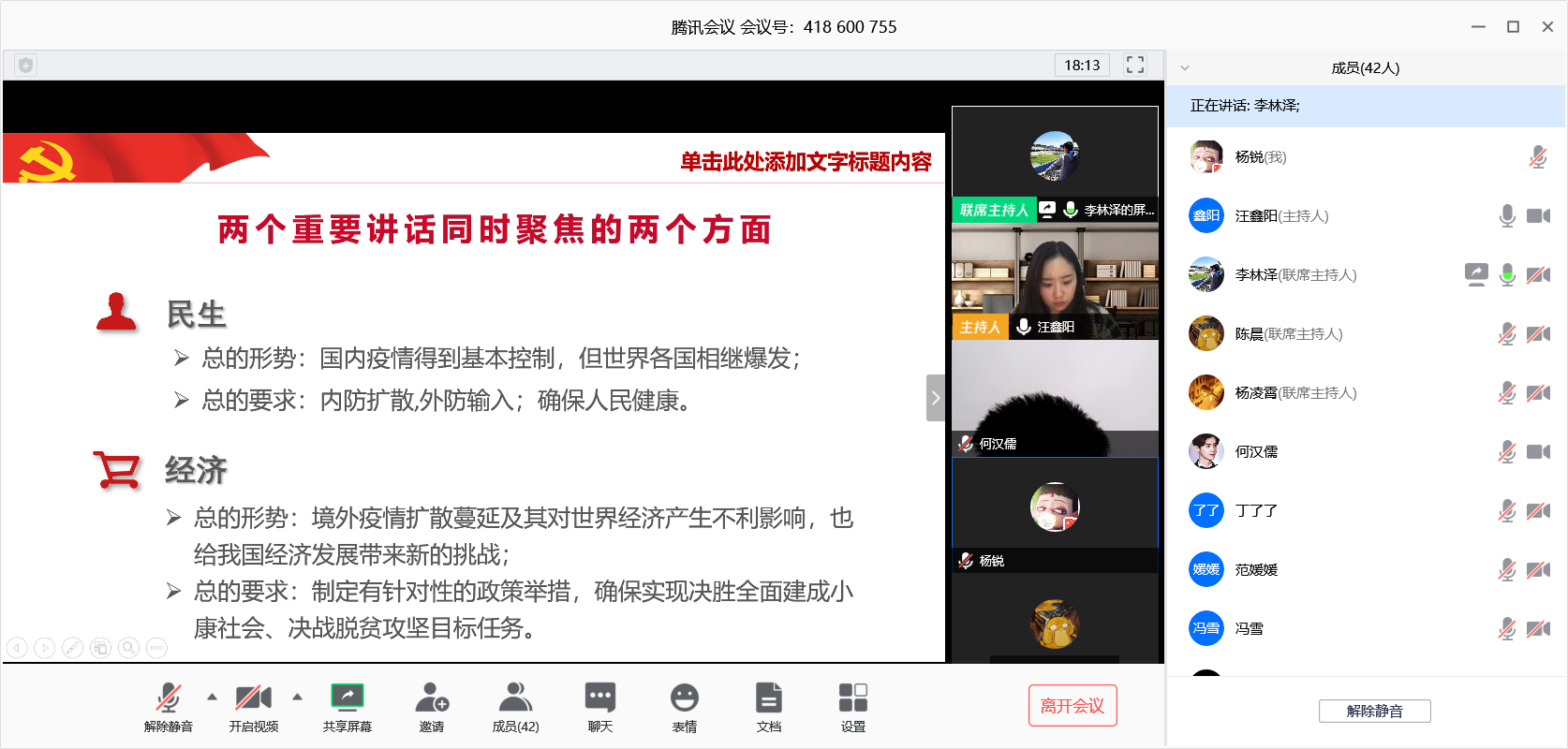 据悉,本次政治理论学习首次采用线上集中学习的模式,主讲团队发挥认真严谨的态度,合理分工,精心准备,于4月2日晚8点对腾讯会议平台进行了测试,确保政治理论学习保质保量完成。