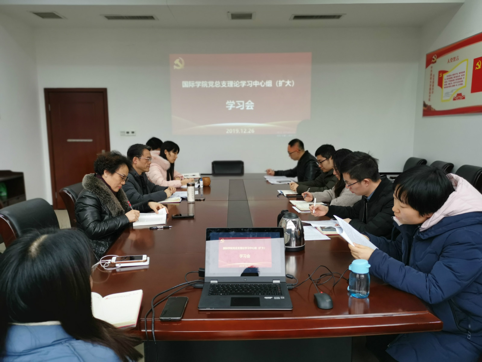 2019年12月26日下午15:30,国际公司党总支在紫云楼304室召开2019年秋季学期第2次党总支理论学习中心组(扩大)学习会,会议主题是:学习传达第十九届四中全会精神。党总支委员、非党总支委员的院领导、各支部书记和支部委员参加会议,北碚公安分局内部安全保卫支队副队长张彬彬同志受邀参会。会议由刘猛书记主持。
