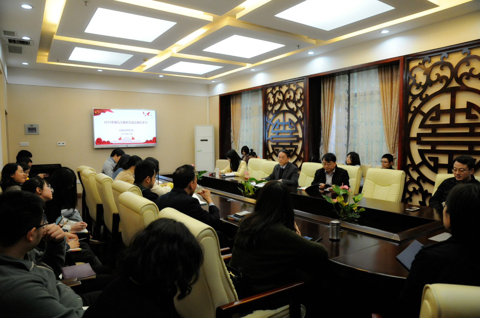 2019年11月8日下午3:00,太阳成集团tyc122cc全体教职工在紫云楼签约室开展本年度第九次政治理论学习活动。会议由刘猛书记主持。
