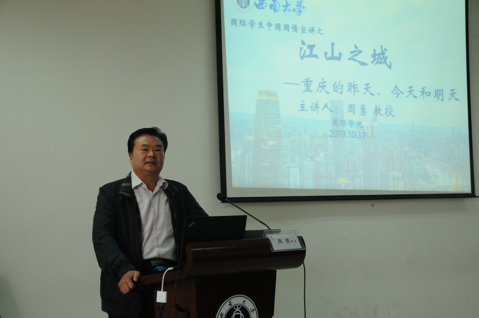 10月17日下午在太阳成集团tyc122cc紫云楼317报告厅,公司国际员工中国国情教育宣讲活动正式启动,国务院特殊津贴获得者、全国有突出贡献的党史专家周勇教授应邀作了题为《江山之城——重庆的昨天、今天和明天》的讲座,180余名中外员工和宣讲团全体成员到场聆听,现场气氛热烈。讲座由刘猛书记主持。