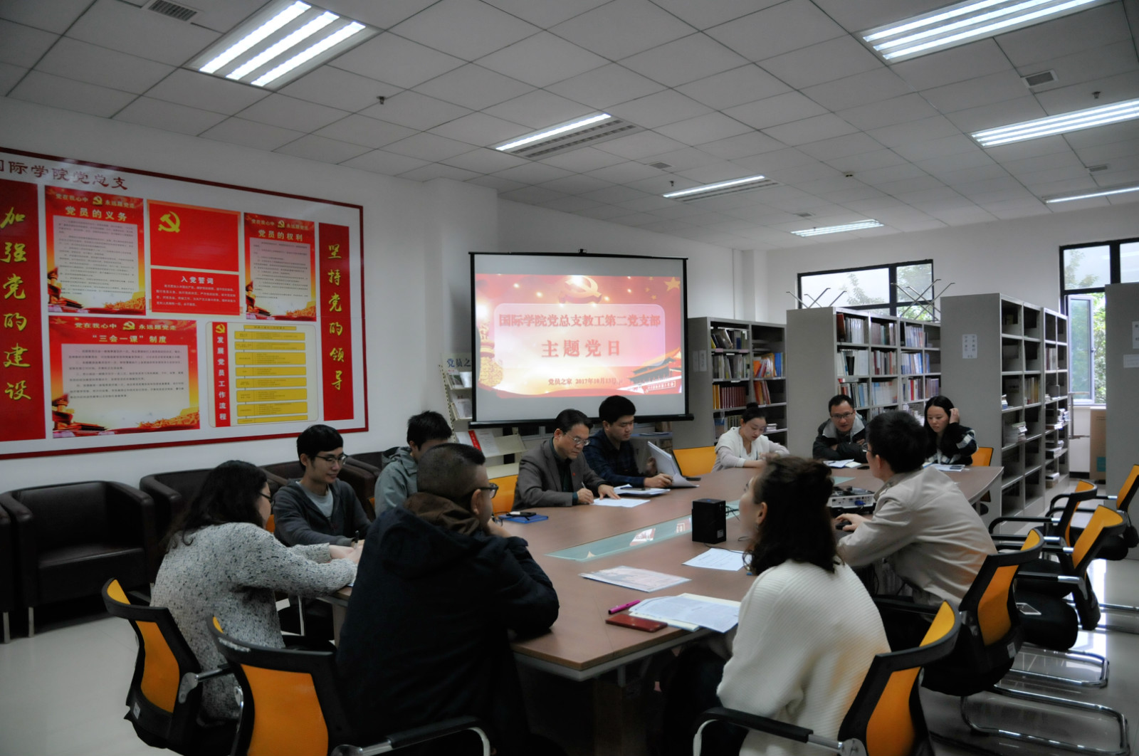 2017年10月13日下午4点,在紫云楼312教室,国际公司党总支研究生第一党支部开展了10月份主题党日活动,并通过实时直播的方式让在海外实习的研究生第二党支部的党员参与其中。会议由研究生第二党支部书记王湛明主持,由研究生第一党支部组织委员刘彦亨主讲党课。
