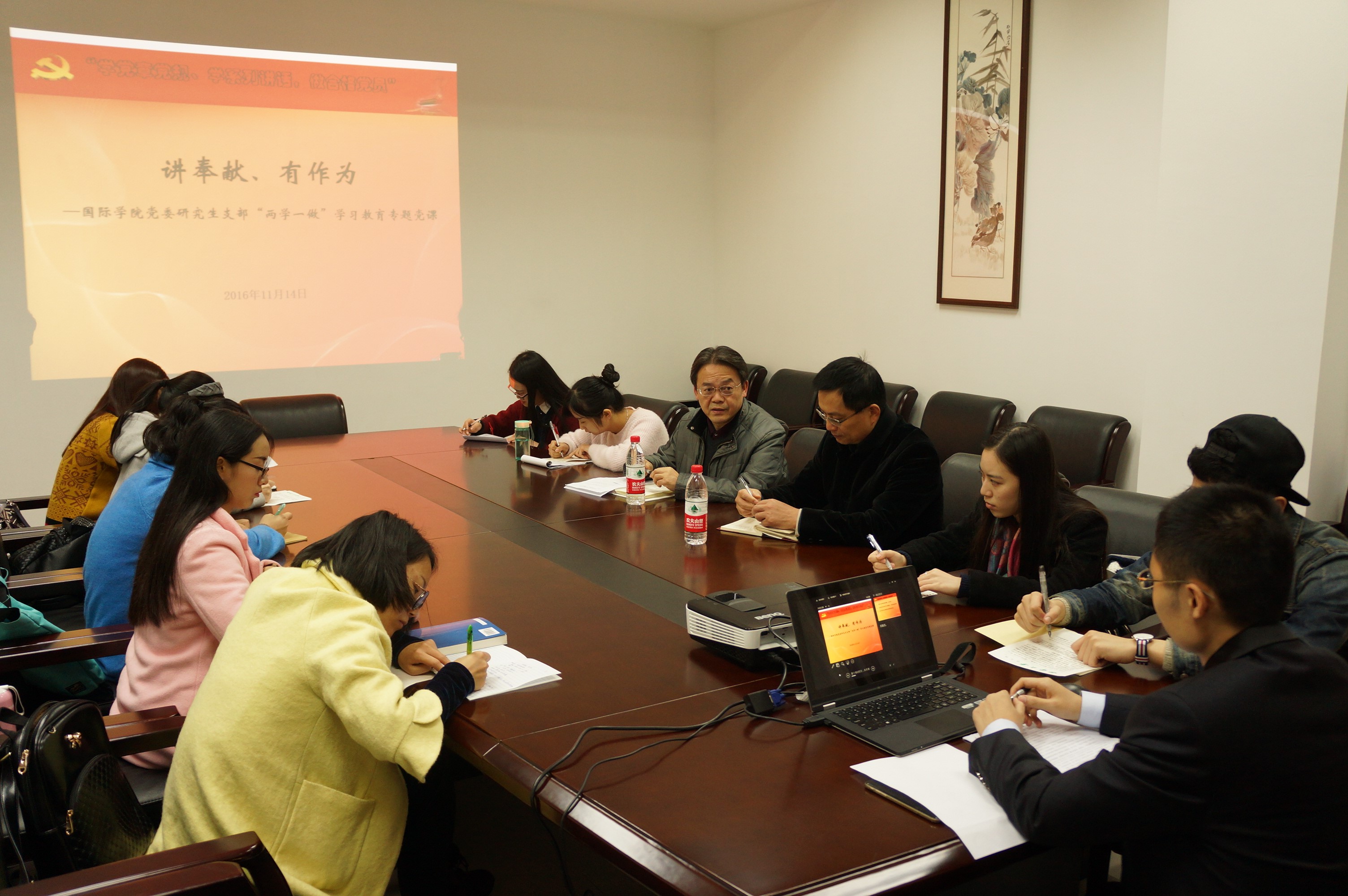 2016年11月14日下午3:00,国际公司党委研究生支部在304会议室举行了以“讲奉献、有作为”为主题的专题学习研讨会。公司党委研究生工作部部长尹晓东出席会议并讲话。公司党委刘猛书记以及支部全体党员(包括入党积极分子)参加组织生活会。会议由支部书记王湛明主持。