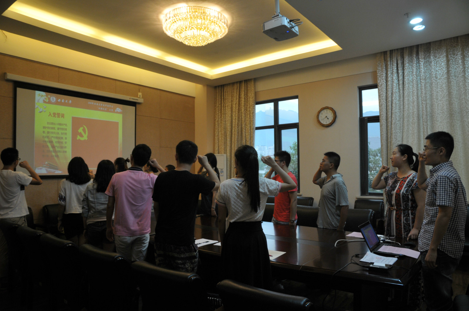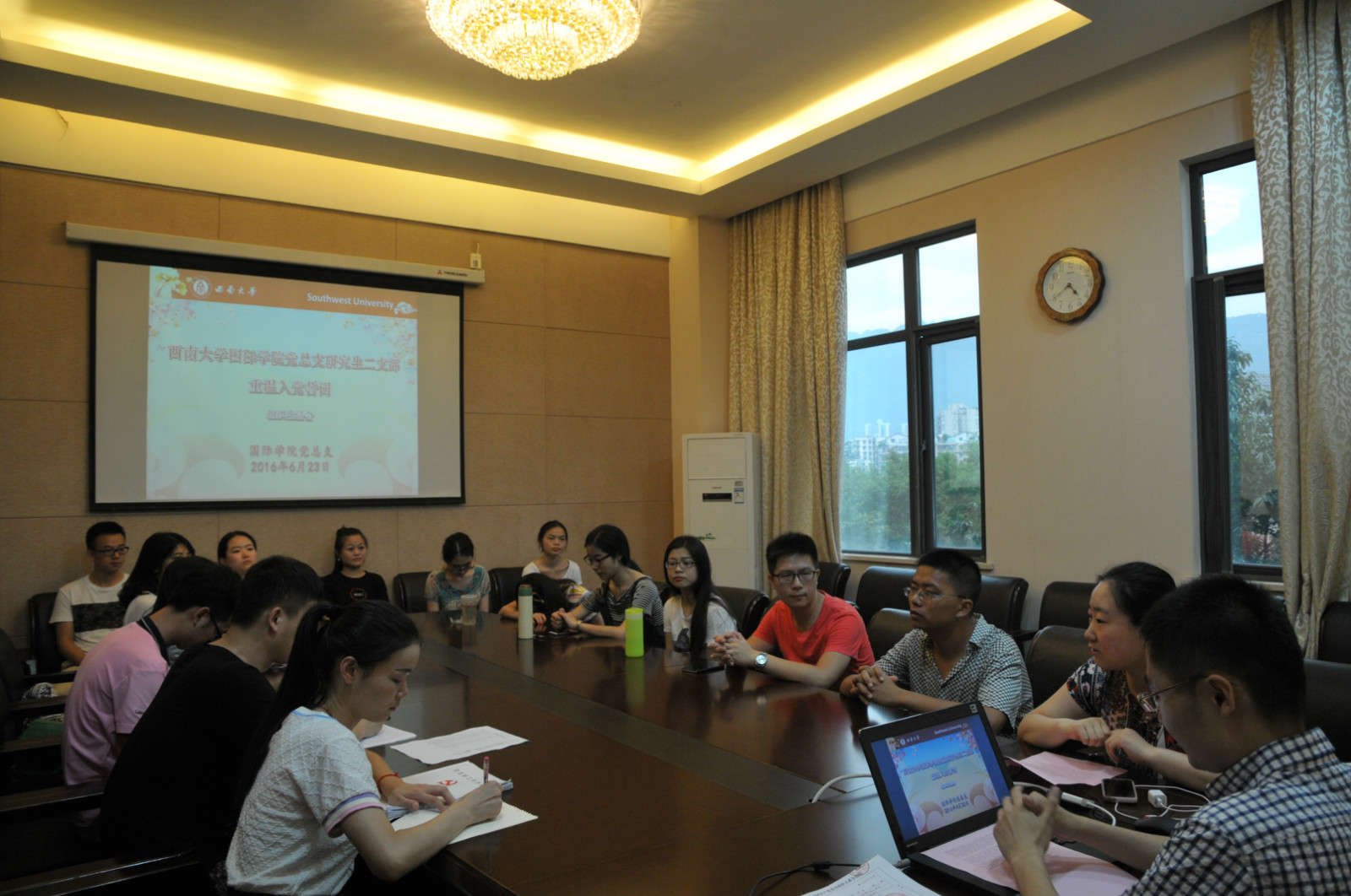 2016年6月23日下午4:30,国际公司党总支研究生二支部在紫云楼310会议室召开了主题为“重温入党誓词”的组织生活会,这也是毕业生党员最后一次参加公司党总支的组织活动。公司党总支宣传委员范媛媛以及支部全体党员参加了本次组织生活会,会议由研究生二支部代理书记王湛明主持。